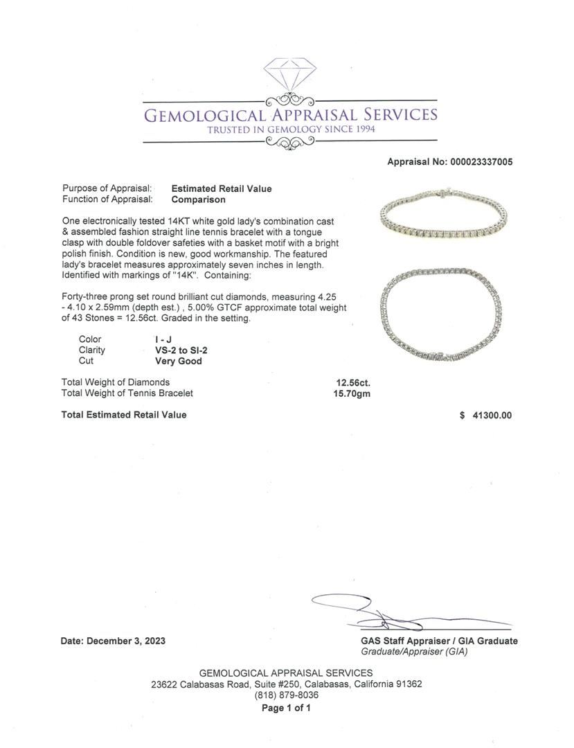 One new 12.56 ctw Diamond Tennis Bracelet - 14KT White Gold. Appraisal Value: $41300. See appraisal for full details.