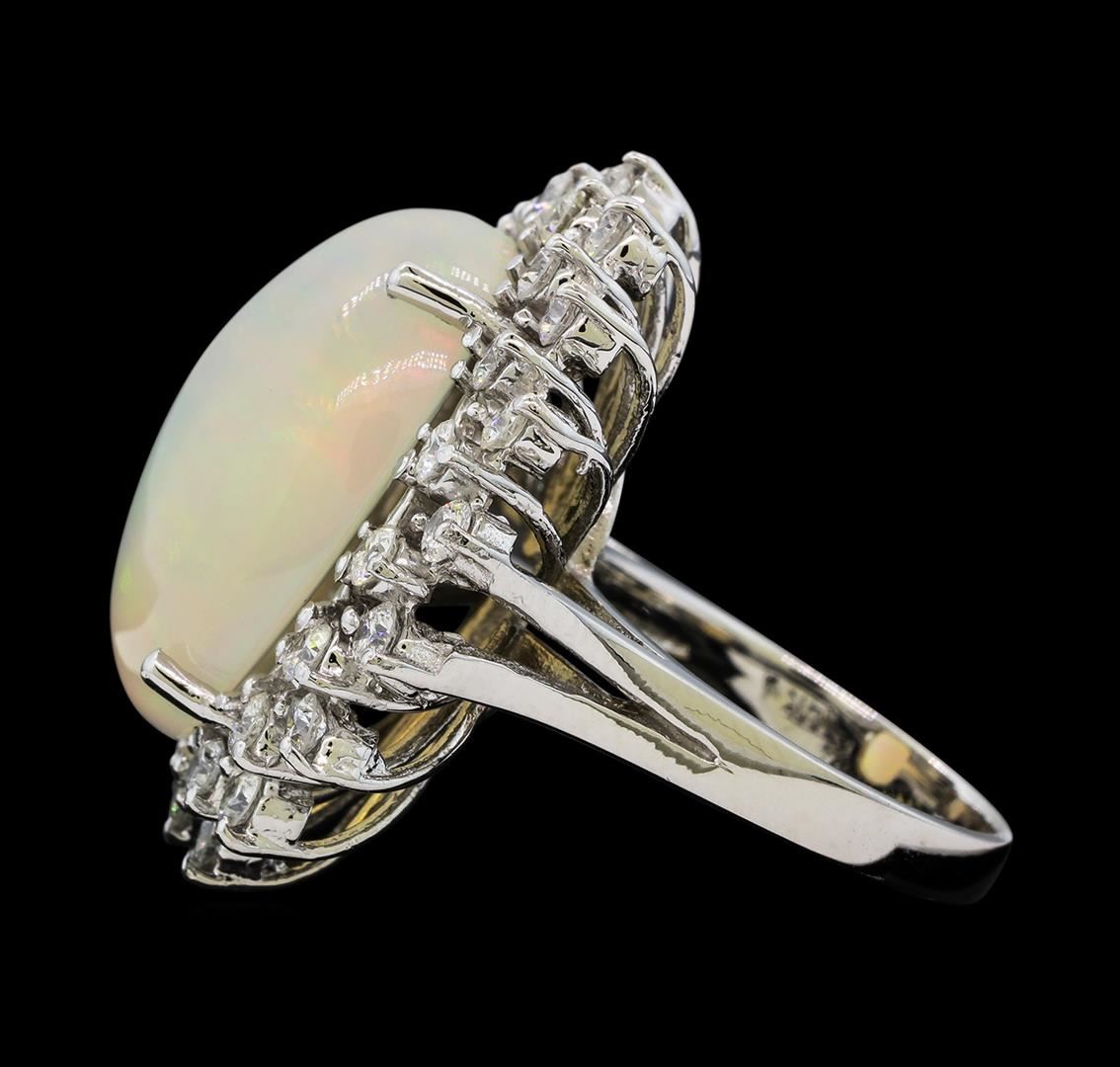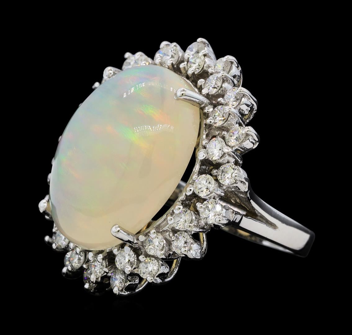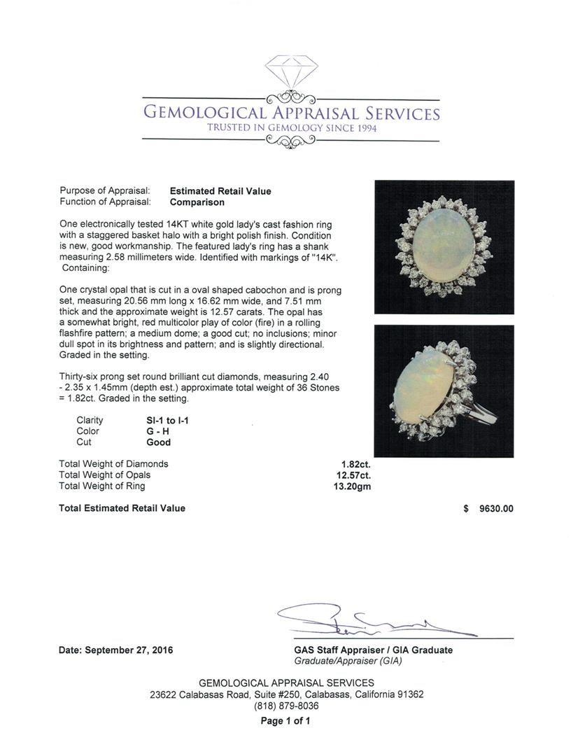 One electronically tested 14KT white gold lady's cast fashion ring with a staggered basket halo with a bright polish finish. The featured lady's ring has a shank measuring 2.58 millimeters wide. Identified with markings of '14K'. Condition is new, good workmanship. Containing: One crystal opal that is cut in a oval shaped cabochon and is prong set, measuring 20.56 mm long x 16.62 mm wide, and 7.51 mm thick and the approximate weight is 12.57 carats. The opal has a somewhat bright, red multicolor play of color (fire) in a rolling flashfire pattern; a medium dome; a good cut; no inclusions; minor dull spot in its brightness and pattern; and is slightly directional. Graded in the setting. Thirty-Six prong set round brilliant cut diamonds, measuring 2.40 - 2.35 x 1.45mm (depth est.) approximate total weight of 36 Stones = 1.82ct. Graded in the setting. Clarity SI-1 to I-1. Color: G - H Cut Good. Total Weight of Diamonds 1.82ct.. Total Weight of Opals 12.57ct.. Total Weight of Ring 13.20gm. GAS Appraised at $9,630.00.