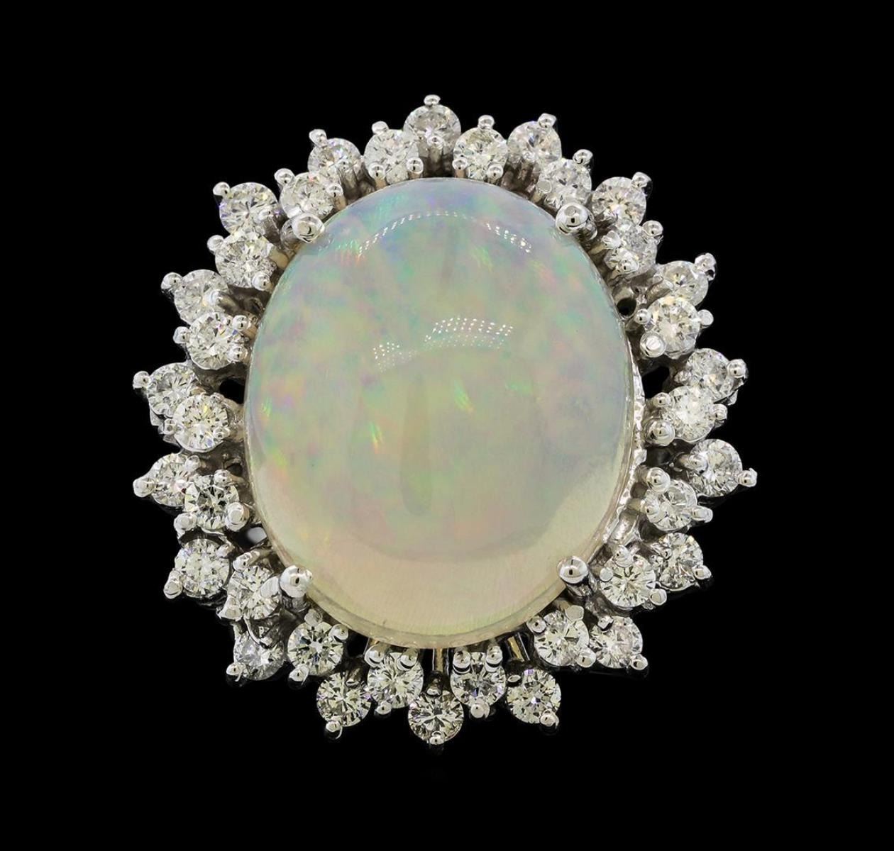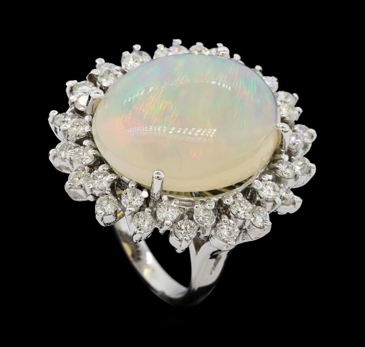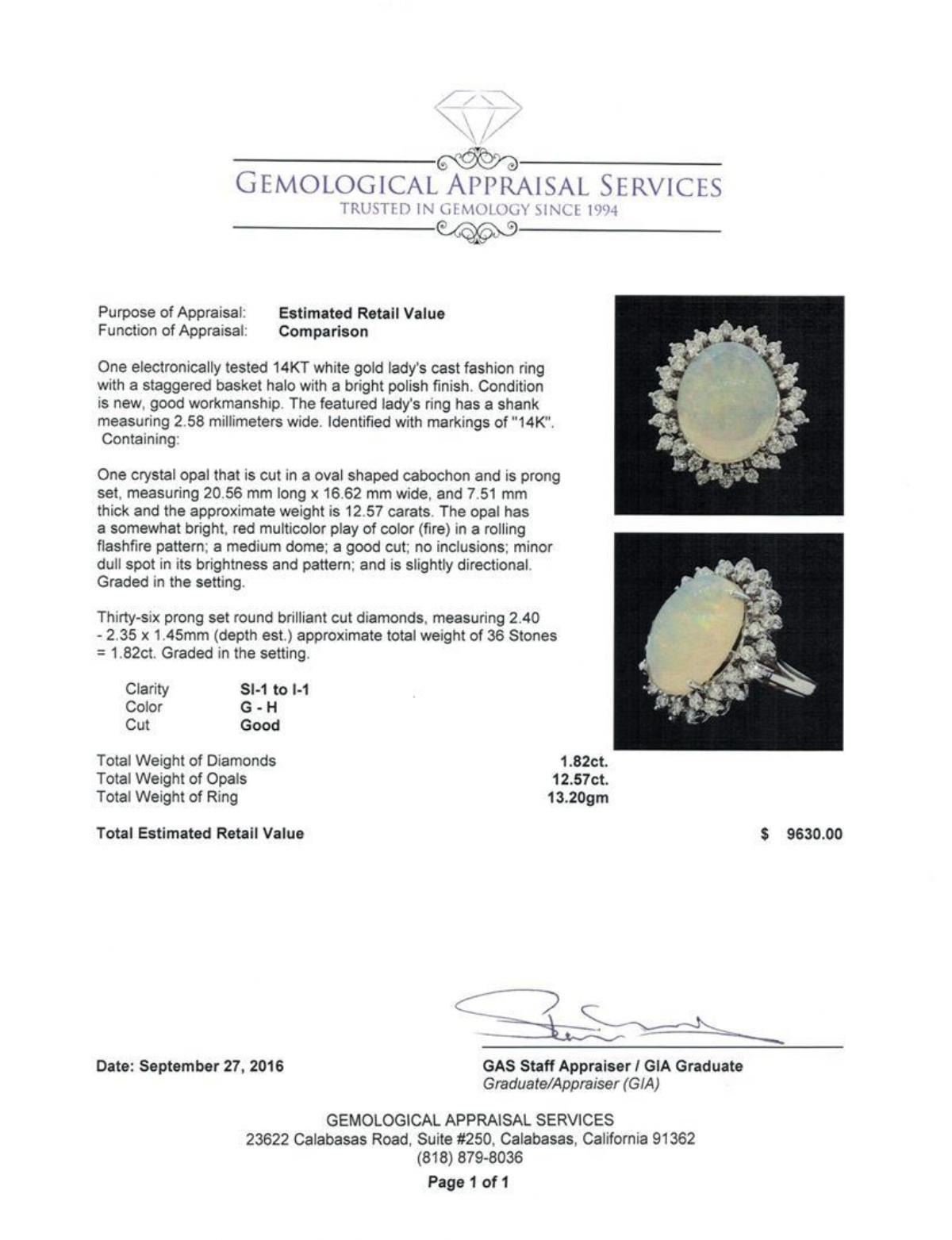 One electronically tested 14KT white gold lady's cast fashion ring with a staggered basket halo with a bright polish finish. The featured lady's ring has a shank measuring 2.58 millimeters wide. Identified with markings of '14K'. Condition is new, good workmanship. Containing: One crystal opal that is cut in a oval shaped cabochon and is prong set, measuring 20.56 mm long x 16.62 mm wide, and 7.51 mm thick and the approximate weight is 12.57 carats. The opal has a somewhat bright, red multicolor play of color (fire) in a rolling flashfire pattern; a medium dome; a good cut; no inclusions; minor dull spot in its brightness and pattern; and is slightly directional. Graded in the setting. Thirty-Six prong set round brilliant cut diamonds, measuring 2.40 - 2.35 x 1.45mm (depth est.) approximate total weight of 36 Stones = 1.82ct. Graded in the setting. Clarity SI-1 to I-1. Color: G - H Cut Good. Total Weight of Diamonds 1.82ct.. Total Weight of Opals 12.57ct.. Total Weight of Ring 13.20gm. GAS Appraised.