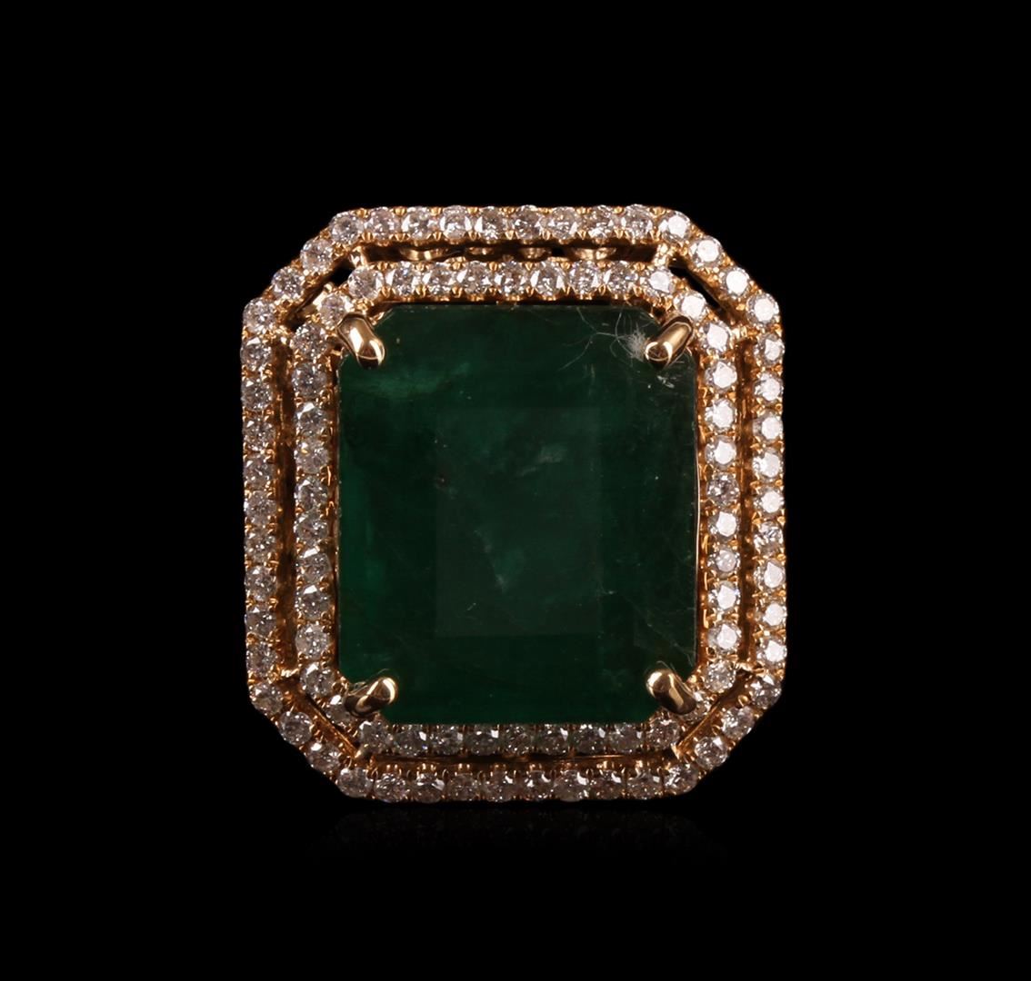 One electronically tested 14KT yellow gold ladies cast emerald and diamond ring with a bright polish finish. The featured emerald is set within tiered diamond bezels supported by diamond set four-way split shoulders, completed by a three and one-half millimeter wide band. Identified with markings of "14K". Condition is new, good workmanship. Containing: One prong set emerald step cut natural emerald, measuring 16.55 x 13.90 x 7.10mm, 5%. bulge factor, approximate weight of 12.59ct., clarity is heavily included, type III, dark, moderately strong, very slightly bluish green color, (GIA vslbG 7/4), cut is good. Transmitting light somewhat diffusely, transparent to translucent. Naturally occurring internal & external characteristics are present. Indications of oil residue. Colored Stone Grading Report attached. Graded in the setting. One Hundred Forty-Eight prong set round brilliant cut diamonds, measuring 1.60 - 1.50 x 0.93mm (depth est.) approximate total weight of 148 Stones = 2.11ct. Graded in the setting. Clarity: I-1 to I-2. Color: G - I. Total Weight of Colored Stones 12.59ct. Total Weight of Diamonds 2.11ct. Total Weight of Ring 11.59gm. AIG Appraised at $20,160.00.