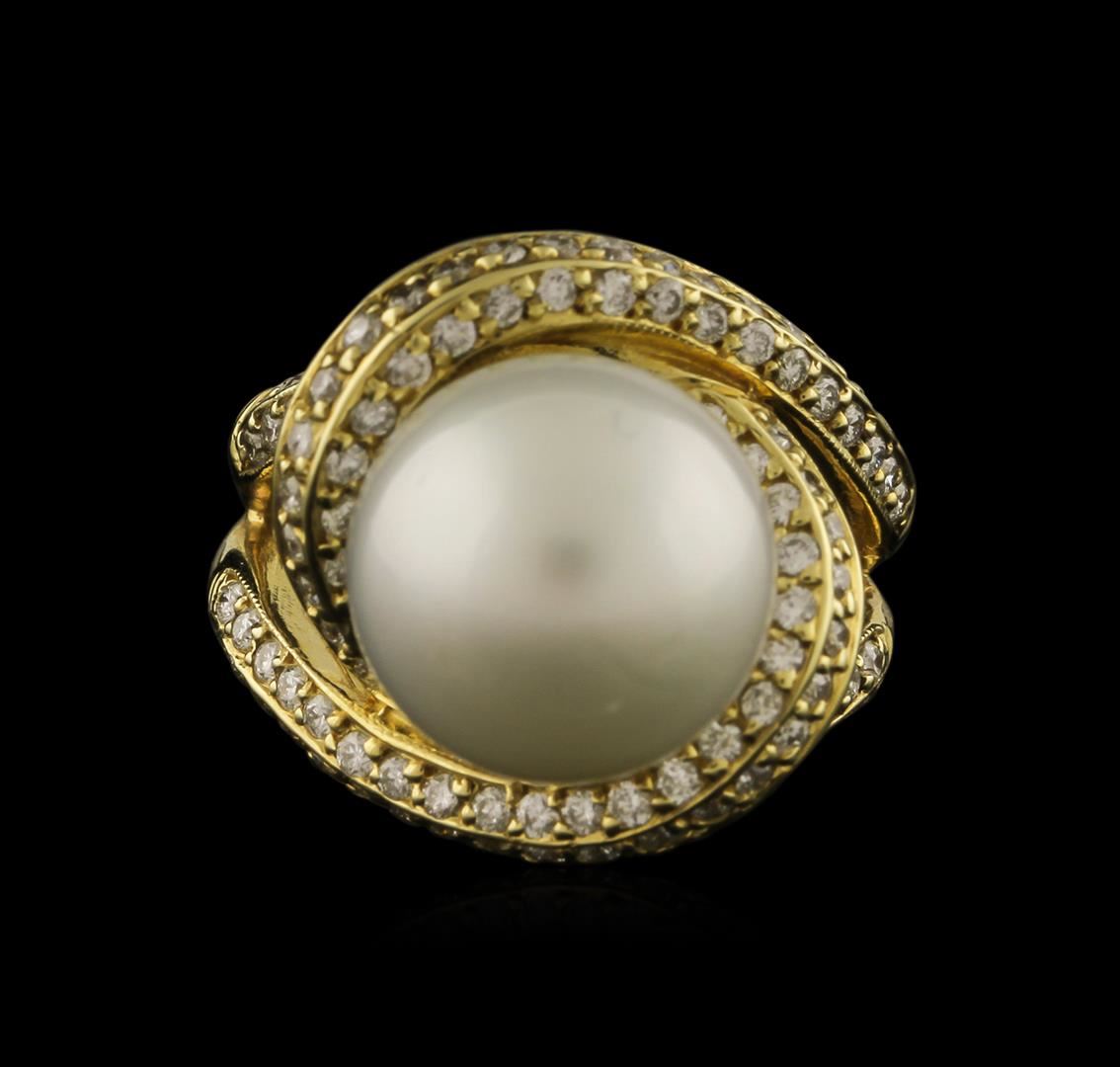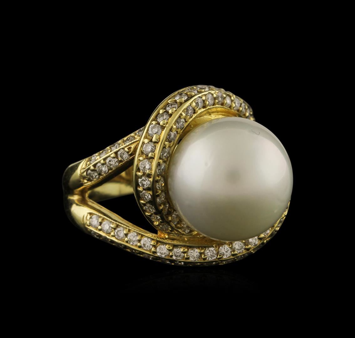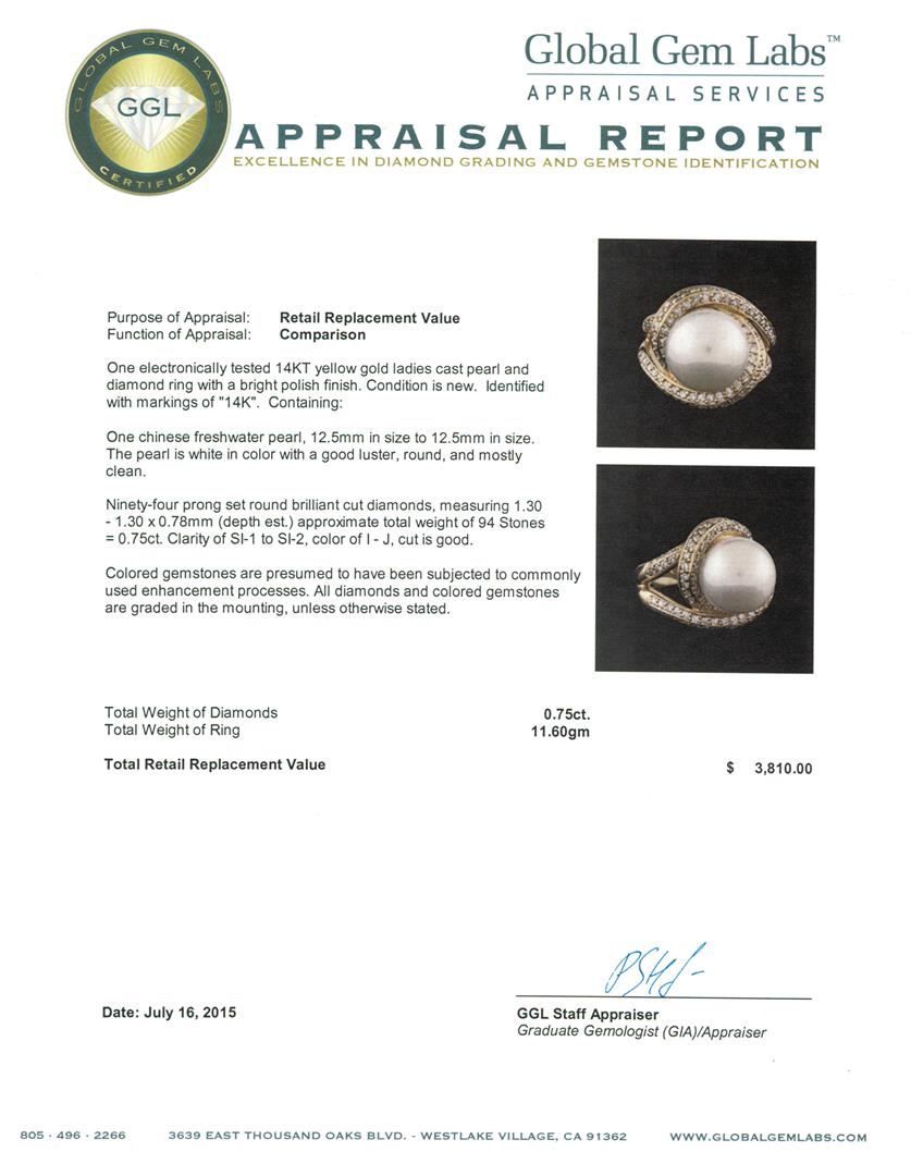 One electronically tested 14KT yellow gold ladies cast pearl and diamond ring with a bright polish finish. Identified with markings of "14K". Condition is new. Containing: One Chinese freshwater pearl, 12.5mm in size to 12.5mm in size. The pearl is white in color with a good luster, round, and mostly clean. Ninety-Four prong set round brilliant cut diamonds, measuring 1.30 - 1.30 x 0.78mm (depth est.) approximate total weight of 94 Stones = 0.75ct. Clarity: SI-1 to SI-2. Color: I - J, Cut is Good. Colored gemstones are presumed to have been subjected to commonly used enhancement processes. All diamonds and colored gemstones are graded in the mounting, unless otherwise stated. Total Weight of Diamonds 0.75ct. Total Weight of Ring 11.60 grams. GGL Appraised at $3,810.00.