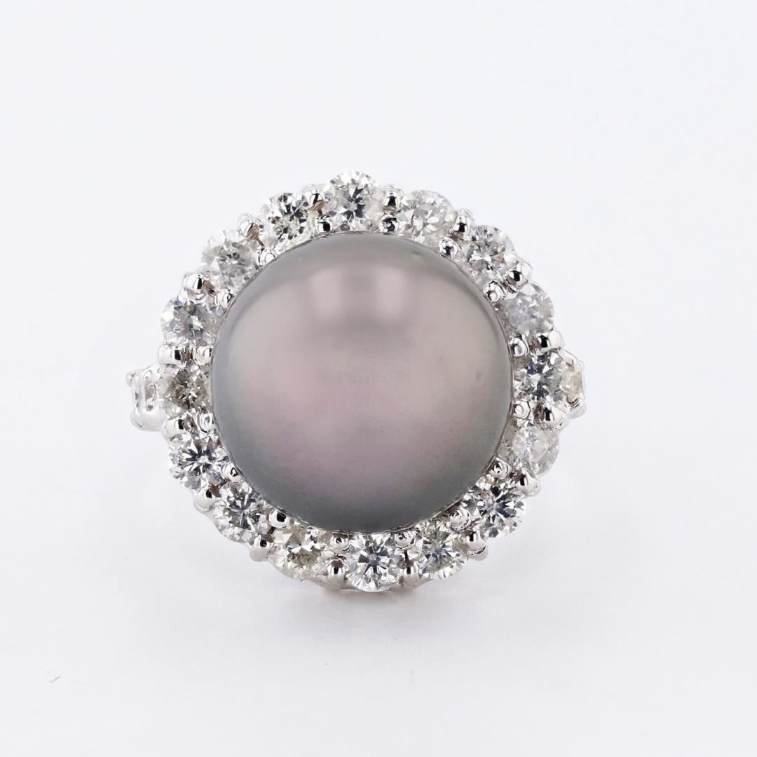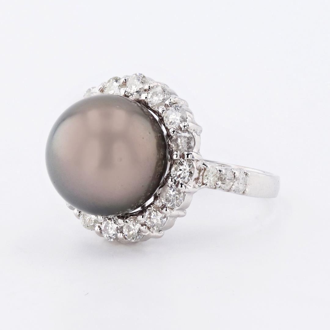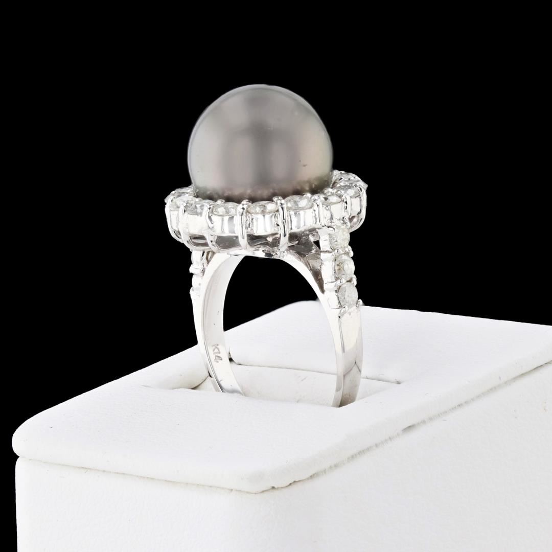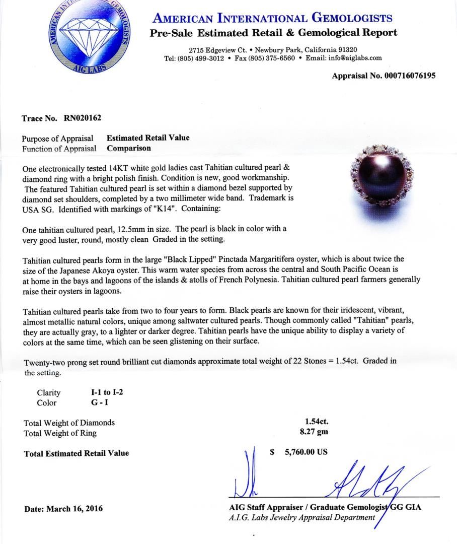 One electronically tested 14KT white gold ladies cast Tahitian cultured pearl & diamond ring with a bright polish finish. Condition is new, good workmanship. The featured Tahitian cultured pearl is set within a diamond bezel supported by diamond set shoulders, completed by a two millimeter wide band. Trademark is USA SG. Identified with markings of "K14". Containing: One Tahitian cultured pearl, 12.5mm in size. The pearl is black in color with a very good luster, round, mostly clean Graded in the setting. Tahitian cultured pearls form in the large "Black Lipped" Pinctada Margaritifera oyster, which is about twice the size of the Japanese Akoya oyster. This warm water species from across the central and South Pacific Ocean is at home in the bays and lagoons of the islands & atolls of French Polynesia. Tahitian cultured pearl farmers generally raise their oysters in lagoons. Tahitian cultured pearls take from two to four years to form. Black pearls are known for their iridescent, vibrant, almost metallic natural colors, unique among saltwater cultured pearls. Though commonly called "Tahitian" pearls, they are actually gray, to a lighter or darker degree. Tahitian pearls have the unique ability to display a variety of colors at the same time, which can be seen glistening on their surface. Twenty-two prong set round brilliant cut diamonds approximate total weight of 22 Stones = 1.54ctw. Graded in the setting. Clarity I1 to I2 Color G - I Total Weight of Diamonds 1.54ctw. Total Weight of Ring 8.27 gm #LREF-2835