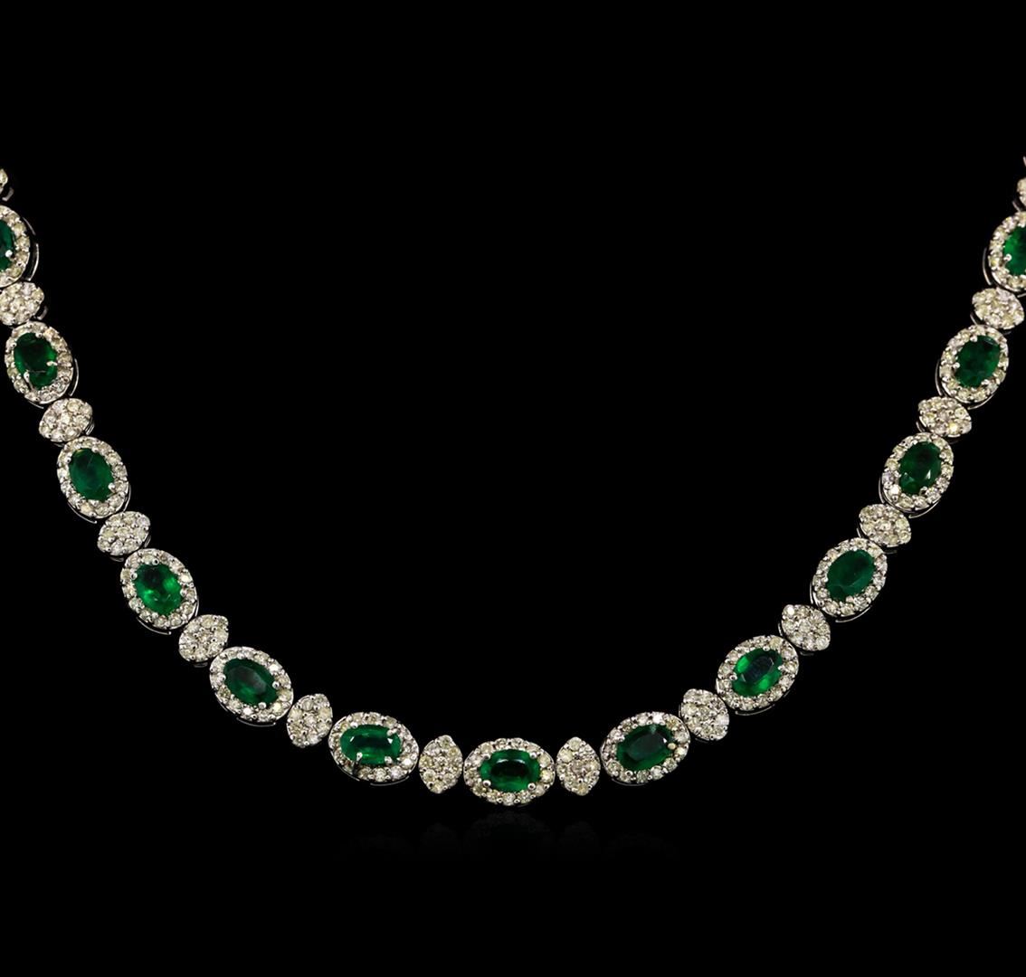 One electronically tested 18KT white gold ladies cast & assembled emerald and diamond necklace with a bright polish finish. Identified with markings of "18K". Condition is good. Containing: Thirty prong set oval mixed cut natural emeralds, measuring 6.00 x 4.00 x 2.70mm, 8%. bulge factor, approximate total weight of 12.67ct., clarity is heavily included, type III, medium dark, moderately strong, very slightly bluish green color, (GIA vslbG 6/4), cut is good. Transmitting light with a minimum of distortion, transparent. Naturally occurring internal & external characteristics are present. Indications of oil, & opticon residue. Measurements & the color grade are an average for the group. Graded in the setting. Six Hundred Sixty prong set round brilliant cut diamonds, measuring 1.30 - 1.30 x 0.78mm (depth est.) approximate total weight of 660 Stones = 5.00ct. Graded in the setting. Clarity: I-1 to I-2. Color: H - I. Total Weight of Colored Stones 12.67ct. Total Weight of Diamonds 5.00ct. AIG Appraised at $32,660.00.