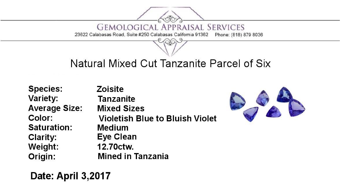 One natural mixed cut tanzanite parcel of six with an exact weight of 12.70 ctw., clarity is eye clean, violetish blue to bluish violet, medium. Gemological Appraisals Services estimates the retail value at $3810 GAS Appraised.