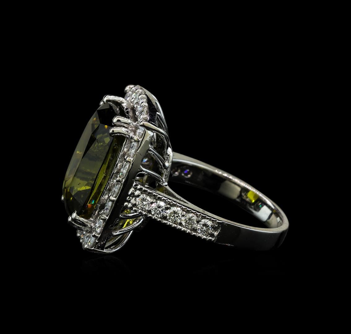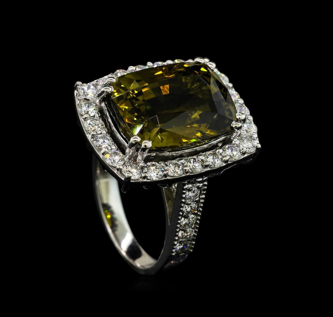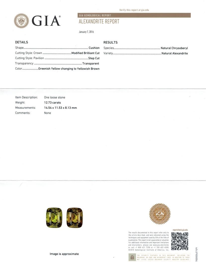 One electronically tested 14KT white gold lady's cast fashion ring with a cathedral shank with a basket halo with a bright polish with milgrain detailing finish. The featured lady's ring has a shank measuring 2.80 millimeters wide. Identified with markings of '14K'. Condition is new, good workmanship. Containing: One prong set rectangular cushion modified mixed cut natural alexandrite, measuring 14.54 x 11.53 x 8.13mm, (depth est.) approximate weight of 12.73ct., clarity is slightly included, cut is very good. The featured alexandrite has a medium dark, moderately strong greenish yellow hue which changes to a medium, moderately strong yellowish brown hue. The stone appears to be African in origin. Transmitting light with no distortion, transparent. Colored gemstones are presumed to have been subjected to commonly used enhancement processes. Graded loose prior to setting in the GIA Laboratory, Report #3215416480. Twenty-Two prong set round brilliant cut diamonds, measuring 2.50 - 2.45 x 1.54mm (depth est.) approximate total weight of 22 Stones = 1.27ct. Graded in the setting. Clarity VS-1 to SI-1. Color: G - H Cut Very Good Ten prong set round brilliant cut diamonds, measuring 2.00 - 1.90 x 1.17mm (depth est.) approximate total weight of 10 Stones = 0.27ct. Graded in the setting. Clarity VS-2 to SI-1. Color: G - H Cut Good. Total Weight of Colored Stones 12.73ct.. Total Weight of Diamonds 1.54ct.. Total Weight of Ring 9.80gm GAS Appraised at $83,750.00.