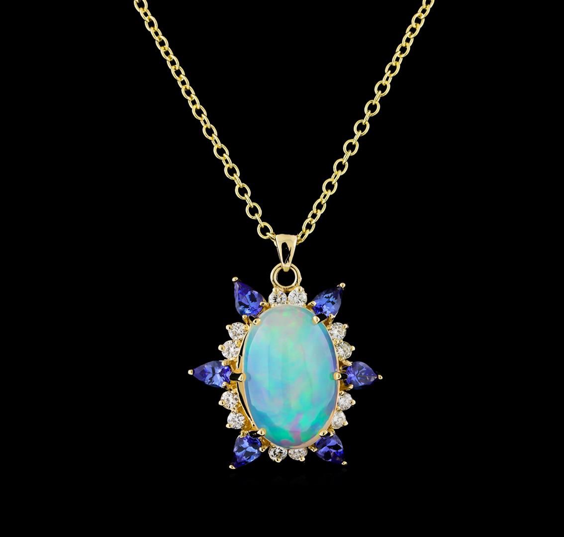 One electronically tested 14KT yellow gold lady's combination cast & assembled fashion pendant & chain 18.0" long, 2.2mm round cable link with a lobster claw clasp with a bright polish finish. The featured lady's pendant has six pear shape Tanzanites equally spaced around the center oval with a drop measurement of 33.5 millimeters in length. Identified with markings of "14K". Condition is new, good workmanship. Containing: Twelve prong set round brilliant cut diamonds, measuring 2.55 - 2.50 x 1.58mm (depth est.) approximate total weight of 12 Stones = 0.74ct. Graded in the setting. Clarity: SI-1 to SI-2. Color: H - I. Cut Good One crystal opal that is cut in a oval shaped cabochon and is prong set, measuring 20.43 mm long x 13.50 mm wide, and 7.40 mm thick and the approximate weight is 12.73 carats. The opal has a bright, blue-green play of color (fire) in a rolling flashfire pattern; a medium dome; a good cut; no inclusions; consistent in its brightness and pattern; and is not directional. Graded in the setting. Six prong set pear modified brilliant cut natural tanzanites, measuring 5.85 x 4.00 x 2.80mm, (depth est.) approximate total weight of 2.47ct., clarity is eye clean, medium, moderately strong, bluish violet color, (GIA bV 5/4), cut is good. Transmitting light with no distortion, transparent. Colored gemstones are presumed to have been subjected to commonly used enhancement processes. Graded in the setting. Total Weight of Colored Stones 2.47ct. Total Weight of Diamonds 0.74ct. Total Weight of Opals 12.73ct. Total Weight of Pendant & Chain 13.30gm. GAS Appraised at $7,455.00.