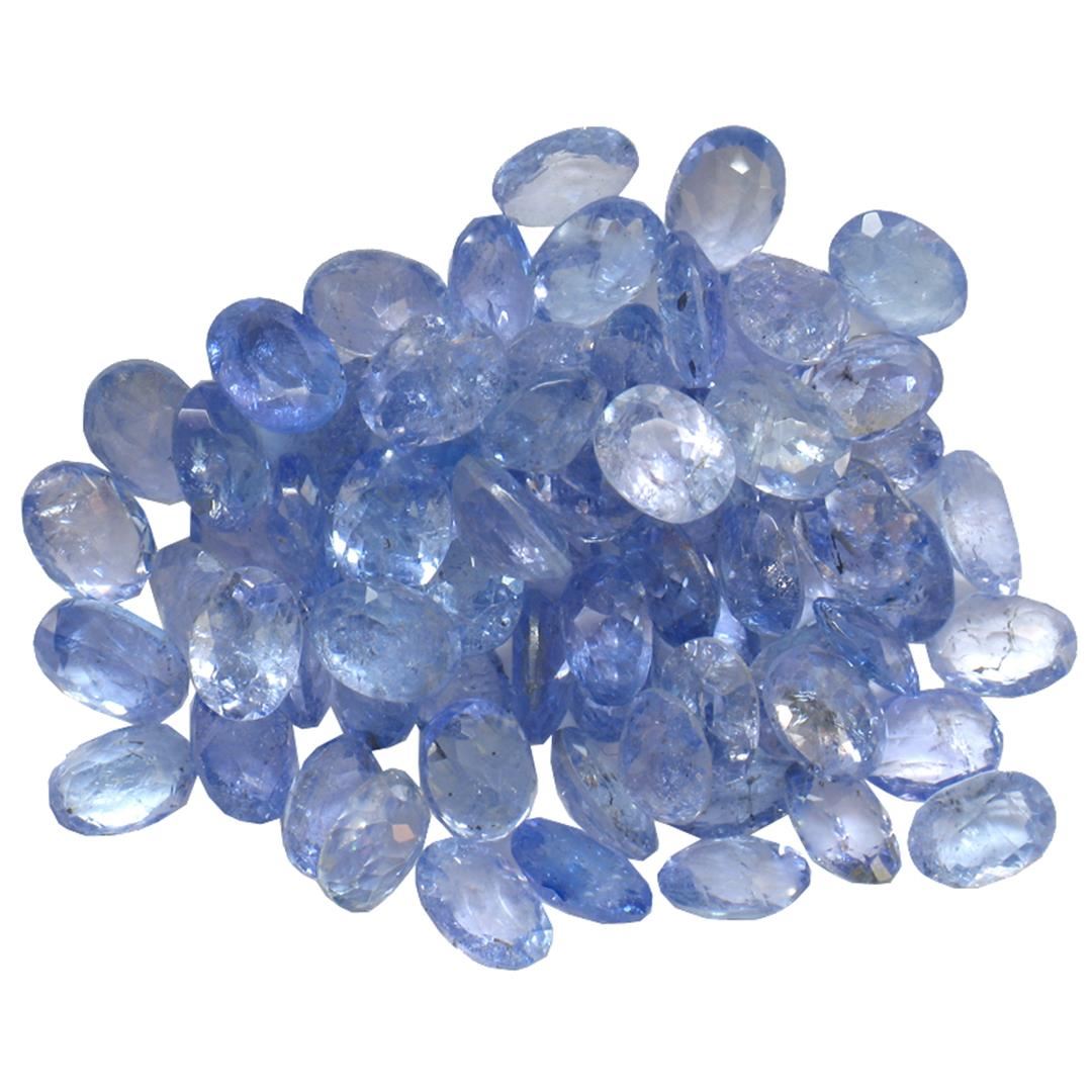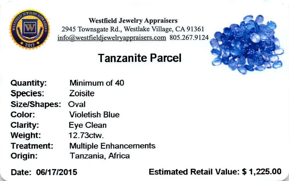 Forty oval mixed cut natural tanzanites exact total weight 12.73ct., clarity is slightly included, type I, medium dark, very slightly grayish, violetish blue color, (GIA vB 6/3), cut is good. Measurements & the color grade are an average for the group, Color grade is an average for the group, Transmitting light with no distortion, transparent, Indications of laboratory high temperature heat treatment. Westfield Appraised at $1,225.00.