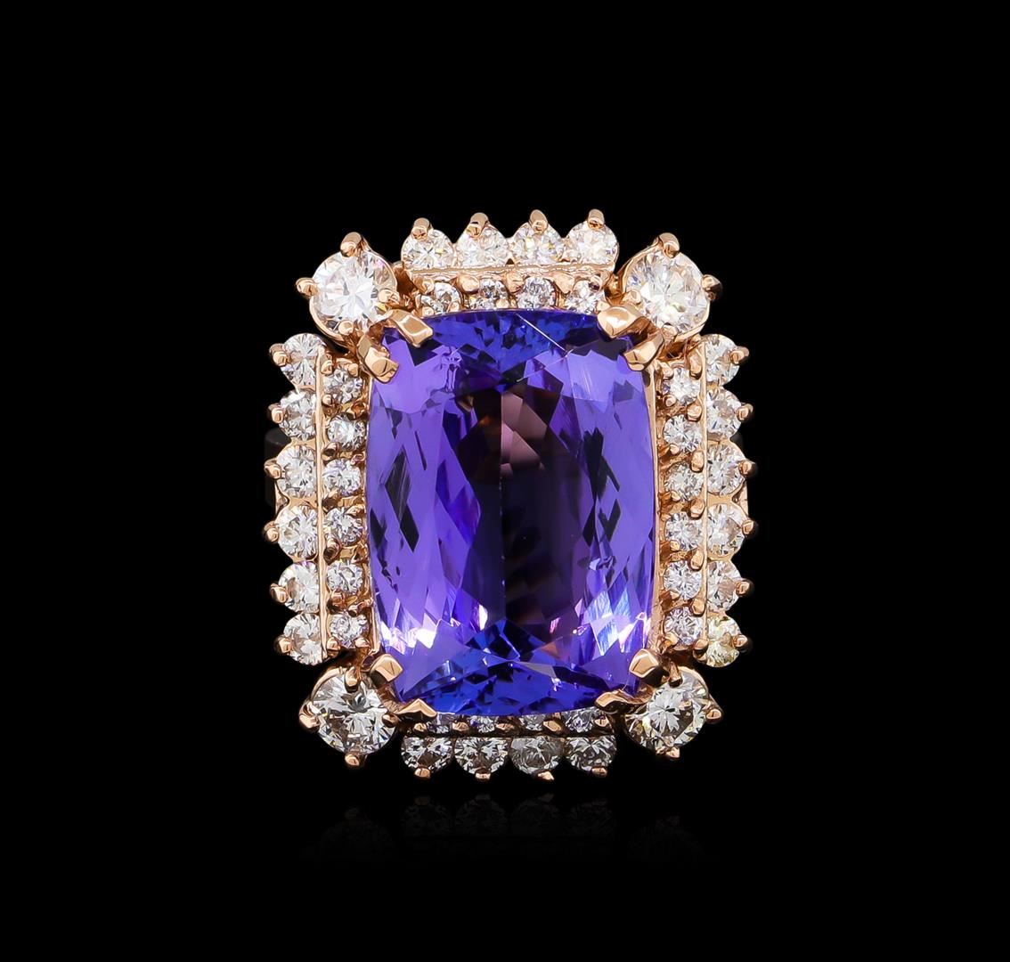 One electronically tested 14KT rose gold ladies cast tanzanite and diamond ring with a bright polish finish. The featured tanzanite is set within a stylized diamond bezel supported by a ribbed under gallery, completed by a two millimeter wide band. Identified with markings of "K14". Condition is new, good workmanship. Containing: One prong set rectangular cushion mixed cut natural tanzanite, measuring 16.50 x 11.70 x 7.00mm, approximate weight of 12.73ct., clarity is eye clean, type I, medium dark, very slightly grayish, bluish violet color, (GIA bV 6/3), cut is good. Transmitting light with no distortion, transparent. Colored Stone Grading Report attached. Graded in the setting. Tanzanite is a very rare gemstone that is only found in the country of Tanzania. Originally discovered in 1967. Tiffany & Company, named the stone Tanzanite. It is found in the Usumburu Mountains that border the Umba Valley of northern Tanzania. Tanzanite occurs in gray, brown, violet, blue, reddish-purple, & green. The gem is interesting because of its exceptional pleochroism. Rotated in different directions a tanzanite will exhibit multiple changes of color. Tanzanite has a low tolerance to ultrasonic cleaning, and should not be cleaned using this method. Forty-Four prong set round brilliant cut diamonds approximate total weight of 44 Stones = 1.76ct. Graded in the setting. Clarity: SI-1 to I-1. Color: E - G. Total Weight of Colored Stones 12.73ct. Total Weight of Diamonds 1.76ct. Total Weight of Ring 12.56gm. AIG Appraised at $35,805.00.