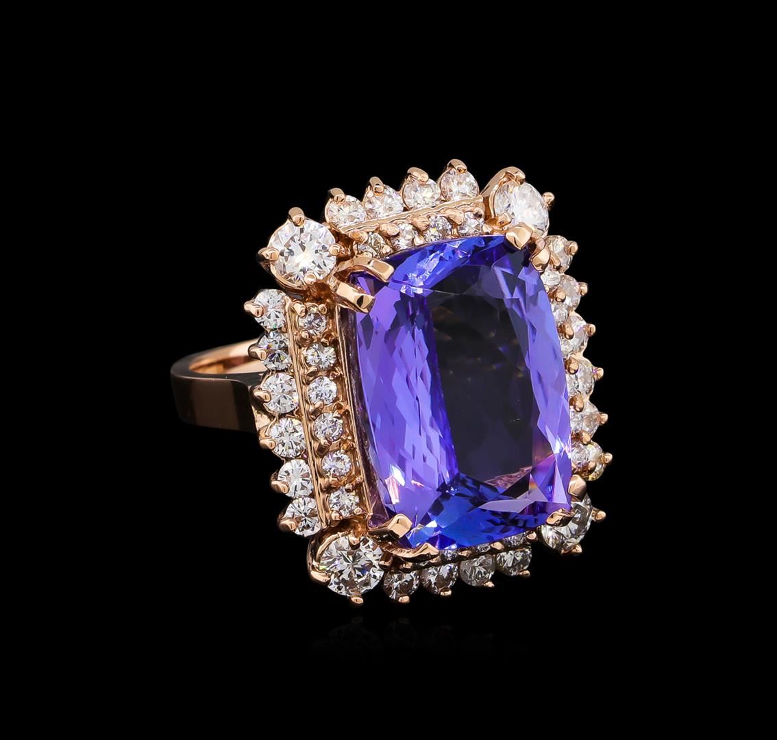One electronically tested 14KT rose gold ladies cast tanzanite and diamond ring with a bright polish finish. The featured tanzanite is set within a stylized diamond bezel supported by a ribbed under gallery, completed by a two millimeter wide band. Identified with markings of "K14". Condition is new, good workmanship. Containing: One prong set rectangular cushion mixed cut natural tanzanite, measuring 16.50 x 11.70 x 7.00mm, approximate weight of 12.73ct., clarity is eye clean, type I, medium dark, very slightly grayish, bluish violet color, (GIA bV 6/3), cut is good. Transmitting light with no distortion, transparent. Colored Stone Grading Report attached. Graded in the setting. Tanzanite is a very rare gemstone that is only found in the country of Tanzania. Originally discovered in 1967. Tiffany & Company, named the stone Tanzanite. It is found in the Usumburu Mountains that border the Umba Valley of northern Tanzania. Tanzanite occurs in gray, brown, violet, blue, reddish-purple, & green. The gem is interesting because of its exceptional pleochroism. Rotated in different directions a tanzanite will exhibit multiple changes of color. Tanzanite has a low tolerance to ultrasonic cleaning, and should not be cleaned using this method. Forty-Four prong set round brilliant cut diamonds approximate total weight of 44 Stones = 1.76ct. Graded in the setting. Clarity: SI-1 to I-1. Color: E - G. Total Weight of Colored Stones 12.73ct. Total Weight of Diamonds 1.76ct. Total Weight of Ring 12.56gm. AIG Appraised at $35,805.00.
