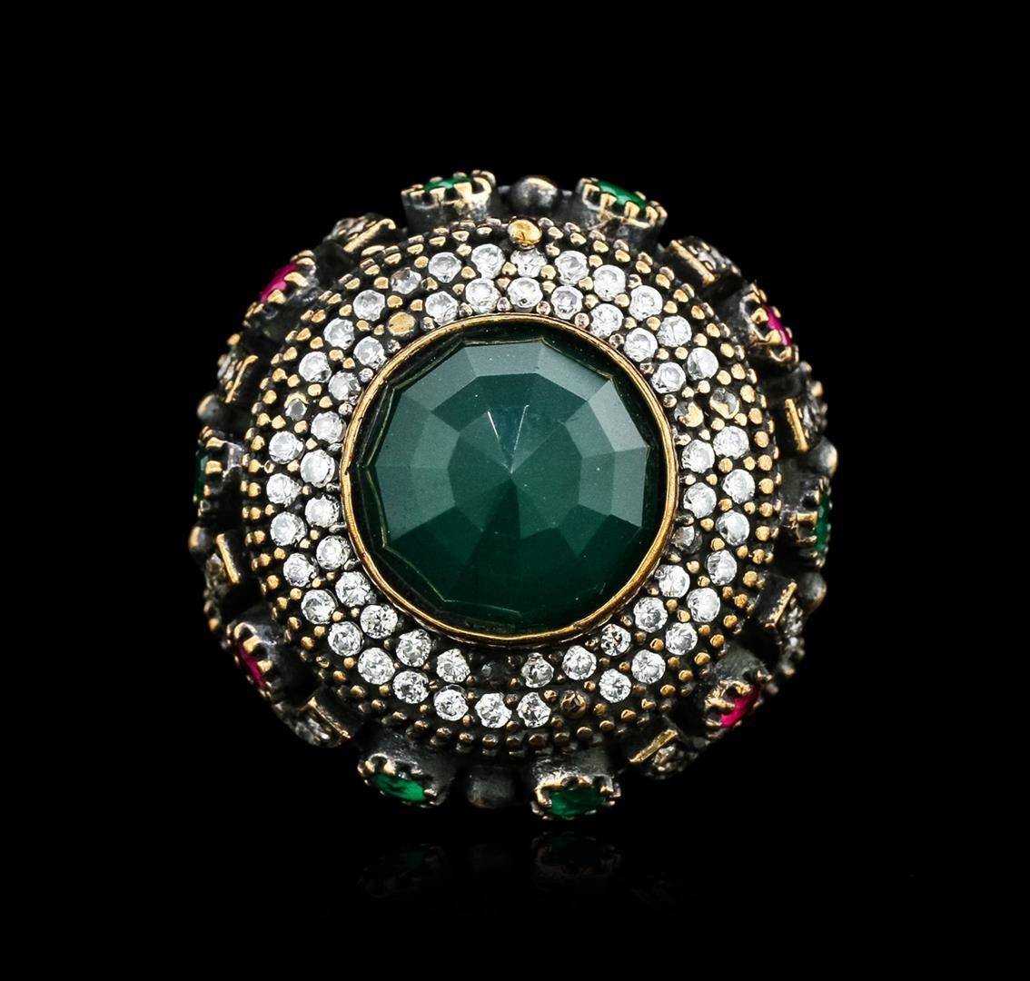 One 12.74ct Green Crystal and Multi Gemstone Ring - 925 SILVER. The featured lab created green crystal is set within tiered cubic zirconia bezels supported by tapering lab created emeralds, lab created rubies and cubic zirconia set shoulders, completed by a four millimeter wide band. Bright and anodized finish. Identified with markings of "925". Condition is new, good workmanship. Containing: One bezel set round mixed cut laboratory created green crystal, measuring 13.00 - 13.00 x 6.50 mm, approximate weight of 12.74ct., clarity is moderately included, medium dark, very slightly grayish, very slightly bluish green color, (GIA vslbG 6/3), cut is good. Two prong set oval mixed cut laboratory created emeralds, measuring 5.50 x 3.00 x 1.95mm, approximate total weight of 0.36ct., clarity is eye clean, type III, dark, moderately strong, very slightly bluish green color, (GIA vslbG 7/4), cut is good. Four bezel set round mixed cut laboratory created emeralds, measuring 3.10 - 3.00 x 1.98 mm, approximate total weight of 0.40ct., clarity is eye clean, type III, dark, moderately strong, very slightly bluish green color, (GIA vslbG 7/4), cut is good. One hundred twenty bead set round brilliant cut laboratory created cubic zirconias, measuring 1.70 - 1.50 x 1.04 mm, approximate total weight of 3.60ct., clarity is eye clean, colorless, very slightly grayish, white color, (GIA W 0/3), cut is good. Eight bezel set round mixed cut laboratory created rubies, measuring 3.10 - 3.00 x 1.98 mm, approximate total weight of 1.20ct., clarity is eye clean, type II, dark, very slightly brownish, red color, (GIA R 7/3), cut is good. Total Weight of Colored Stones 18.30ct. Total Weight of Ring 24.66gm. AIG Appraised at $2,030.00.