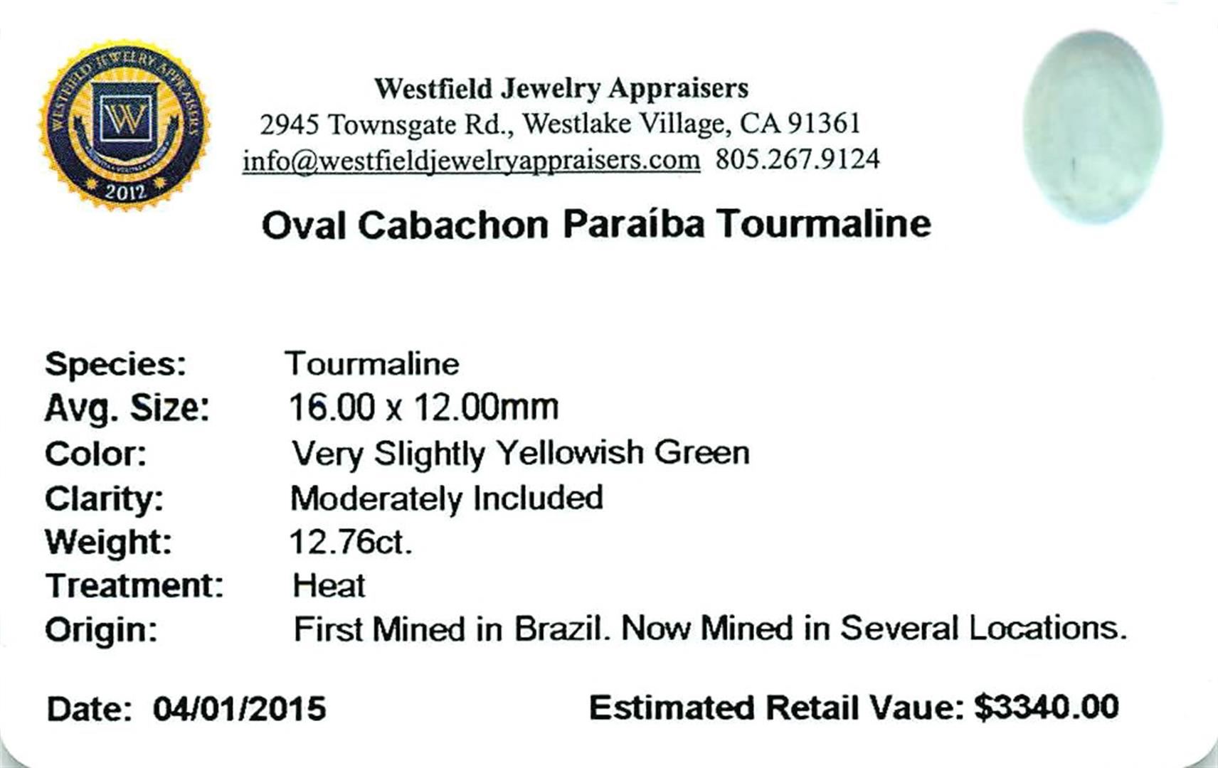 One oval cabochon cut natural Paraiba tourmaline exact weight 12.76ct., clarity is moderately included, cut is good. Westfield Appraised at $3,340.00.