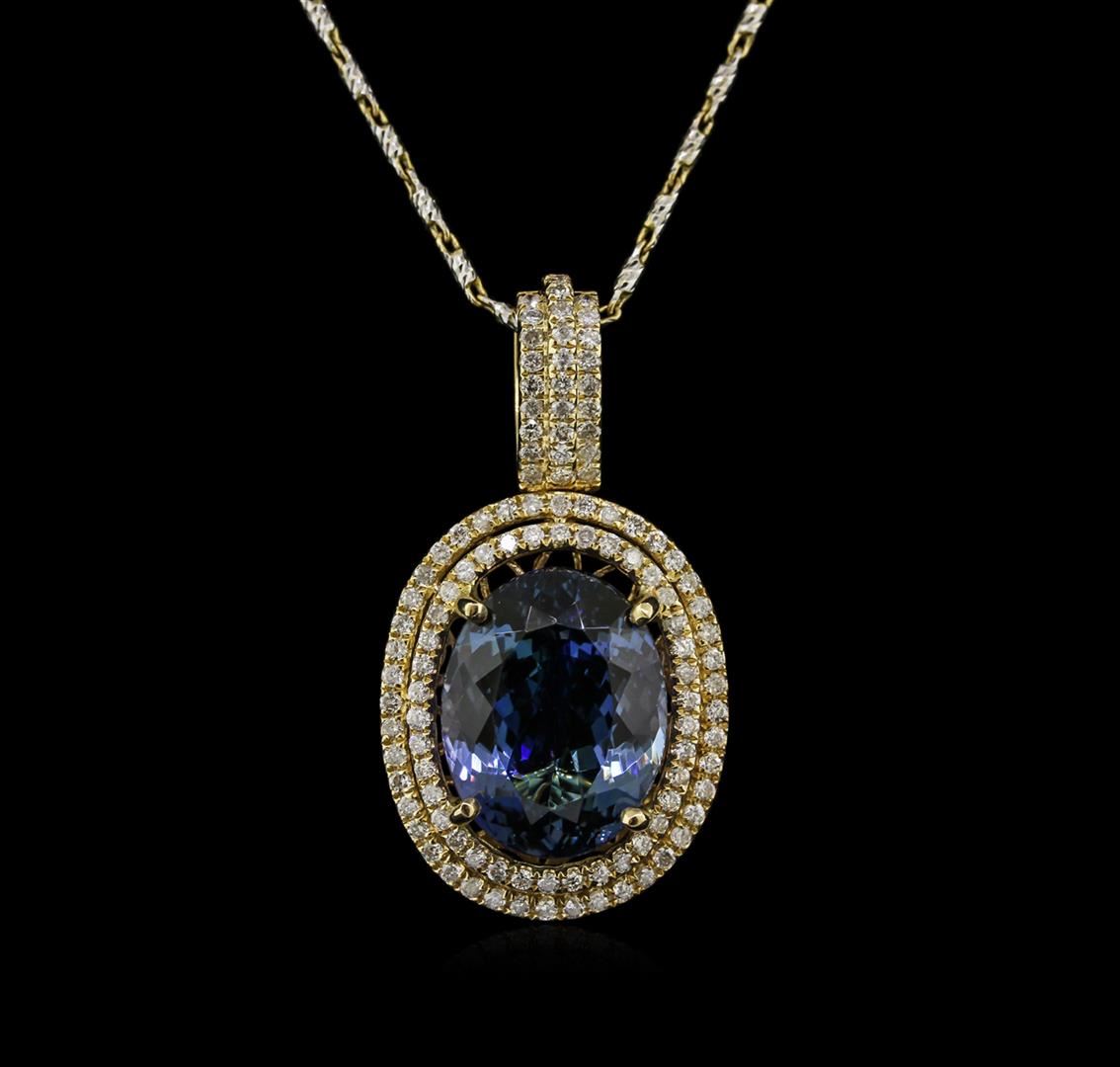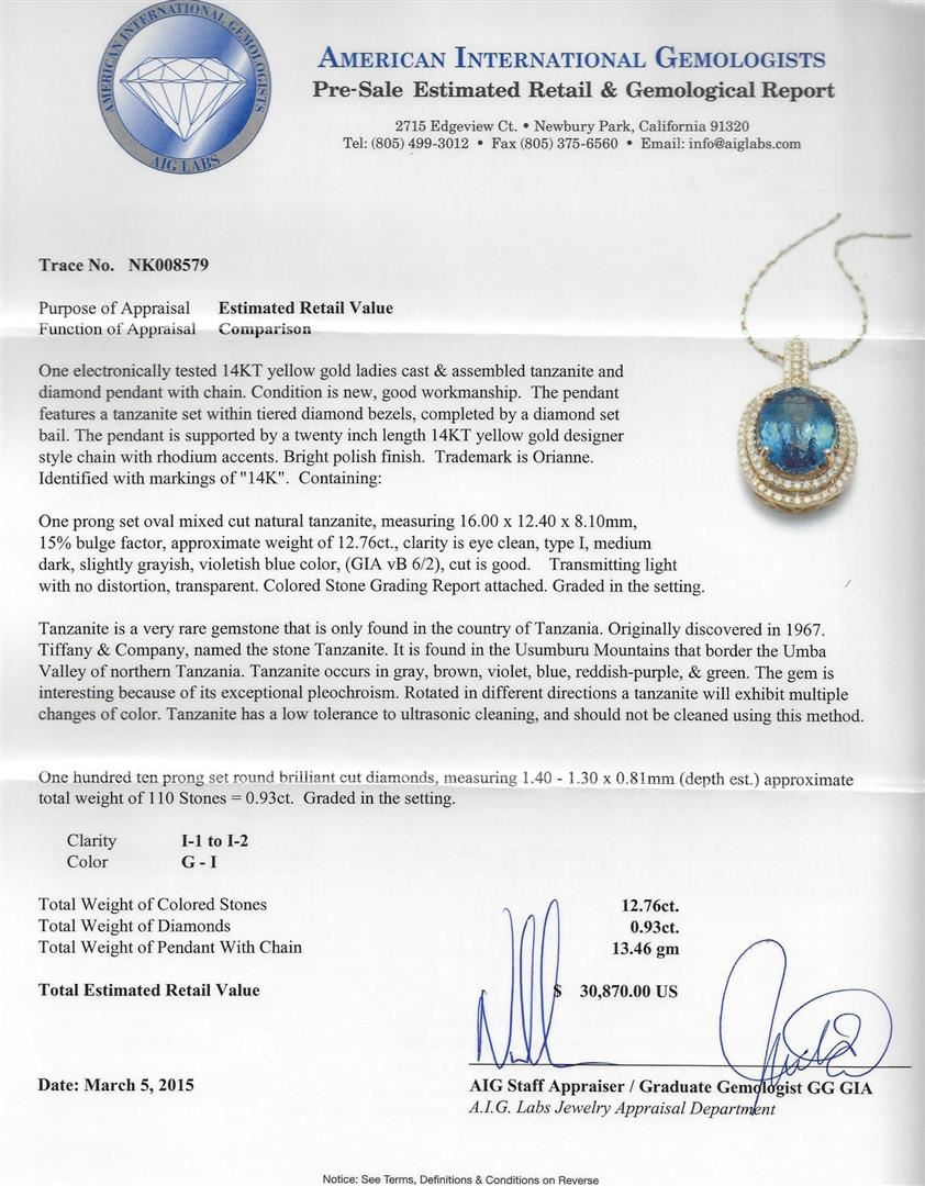One electronically tested 14KT yellow gold ladies cast & assembled tanzanite and diamond pendant with chain. Condition is new, good workmanship. The pendant features a tanzanite set within tiered diamond bezels, completed by a diamond set bail. The pendant is supported by a twenty inch length 14KT yellow gold designer style chain with rhodium accents. Bright polish finish. Trademark is Orianne. Identified with markings of" 14K". Containing: One prong set oval mixed cut natural tanzanite, measuring 16.00 x 12.40 x 8.10mm, 15% bulge factor, approximate weight of 12.76ct., clarity is eye clean, type I, medium dark, slightly grayish, violetish blue color, (GIA vB 6/2),cut is good. Transmitting light with no distortion, transparent. Colored Stone Grading Report attached. Graded in the setting. Tanzanite is a very rare gemstone that is only found in the country of Tanzania. Originally discovered in 1967.Tiffany & Company, named the stone Tanzanite. It is found in the Usumbura Mountains that border the Umba Valley of northern Tanzania. Tanzanite occurs in gray, brown, violet, blue, reddish-purple, & green. The gem is interesting because of its exceptional pleochroism. Rotated in different directions a tanzanite will exhibit multiple changes of color. Tanzanite has a low tolerance to ultrasonic cleaning, and should not be cleaned using this method. One hundred ten prong set round brilliant cut diamonds, measuring 1.40 - 1.30 x 0.81mm (depth est.) approximate total weight of 110 Stones = 0.93ct. Graded in the setting. Clarity: I-1 to I-2. Color: G-I. AIG Appraised at $30,870.00.