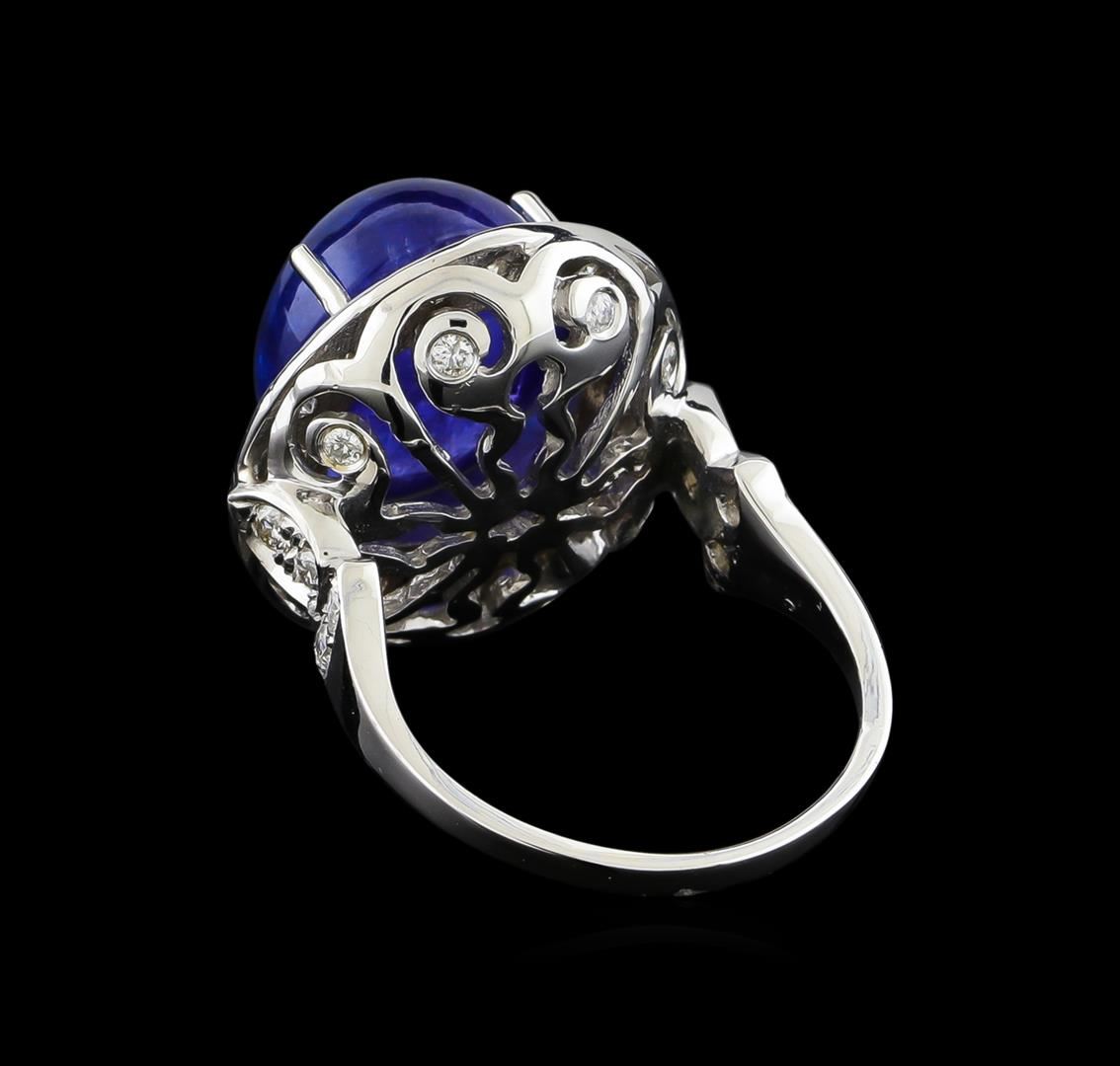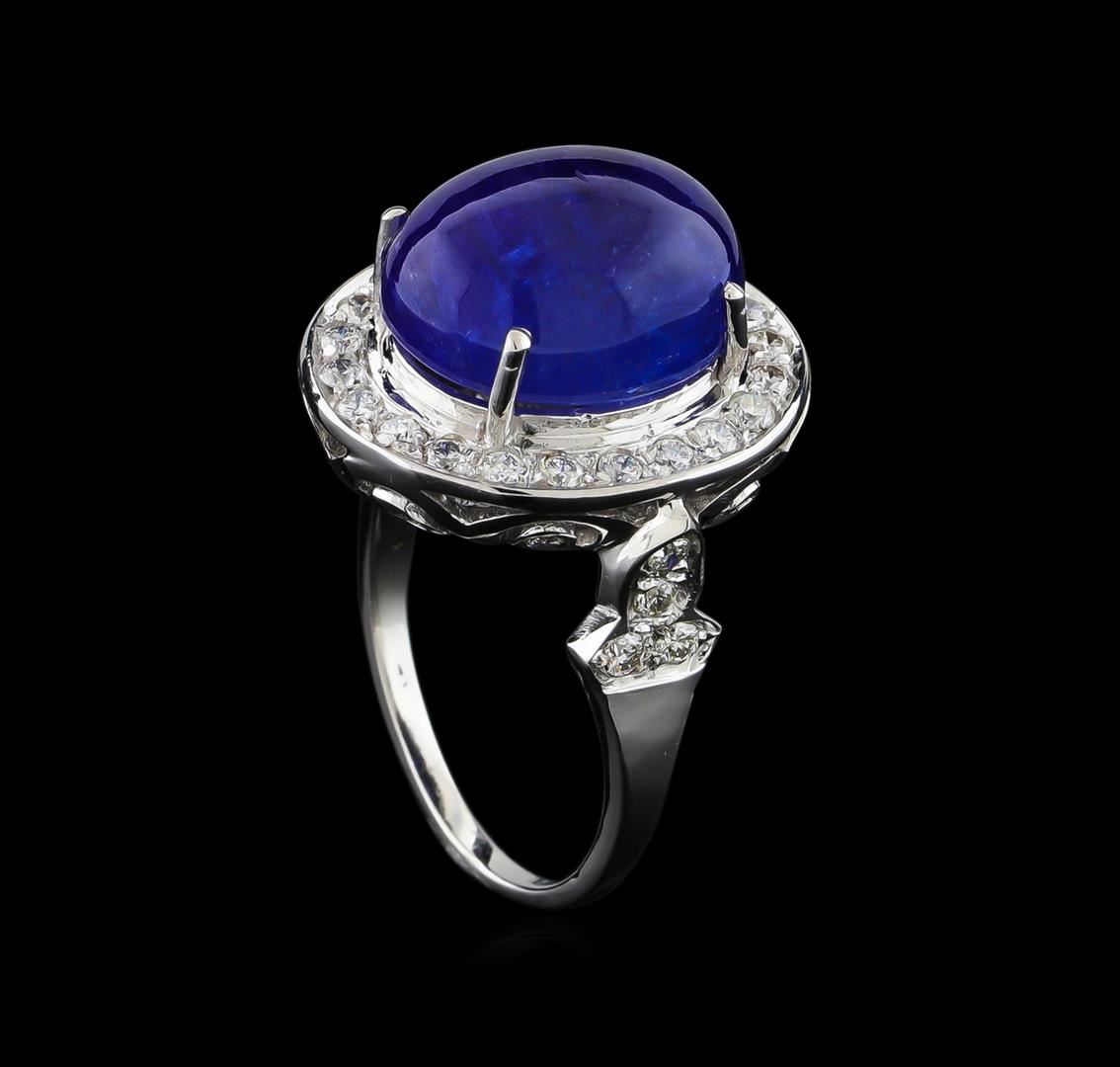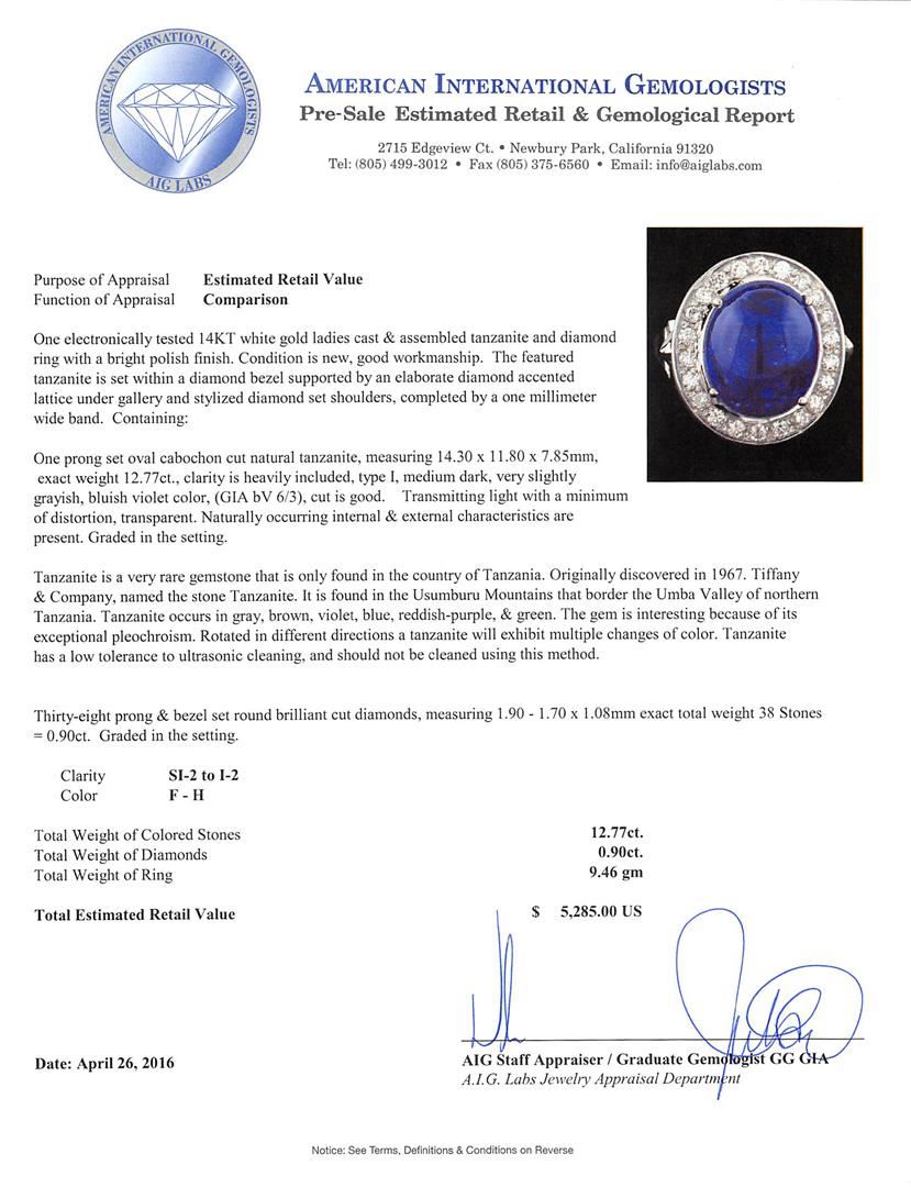 One electronically tested 14KT white gold ladies cast & assembled tanzanite and diamond ring with a bright polish finish. The featured tanzanite is set within a diamond bezel supported by an elaborate diamond accented lattice under gallery and stylized diamond set shoulders, completed by a one millimeter wide band. Condition is new, good workmanship. Containing: One prong set oval cabochon cut natural tanzanite, measuring 14.30 x 11.80 x 7.85mm, exact weight 12.77ct., clarity is heavily included, type I, medium dark, very slightly grayish, bluish violet color, (GIA bV 6/3), cut is good. Transmitting light with a minimum of distortion, transparent. Naturally occurring internal & external characteristics are present. Graded in the setting. Tanzanite is a very rare gemstone that is only found in the country of Tanzania. Originally discovered in 1967. Tiffany & Company, named the stone Tanzanite. It is found in the Usumburu Mountains that border the Umba Valley of northern Tanzania. Tanzanite occurs in gray, brown, violet, blue, reddish-purple, & green. The gem is interesting because of its exceptional pleochroism. Rotated in different directions a tanzanite will exhibit multiple changes of color. Tanzanite has a low tolerance to ultrasonic cleaning, and should not be cleaned using this method. Thirty-Eight prong & bezel set round brilliant cut diamonds, measuring 1.90 - 1.70 x 1.08mm exact total weight 38 Stones = 0.90ct. Graded in the setting. Clarity: SI-2 to I-2. Color: F - H. Total Weight of Colored Stones 12.77ct. Total Weight of Diamonds 0.90ct. Total Weight of Ring 9.46gm. AIG Appraised at $5,285.00.