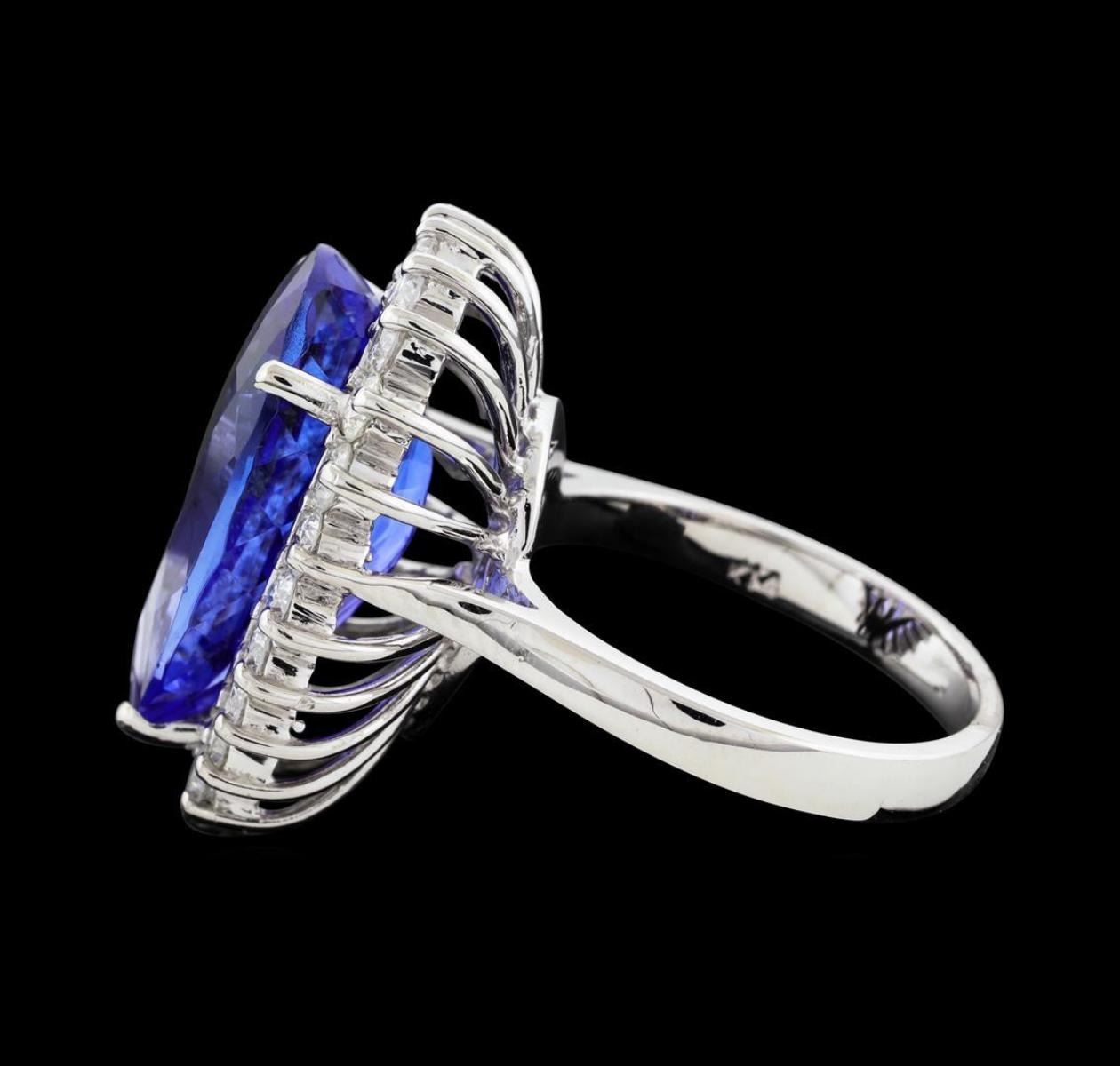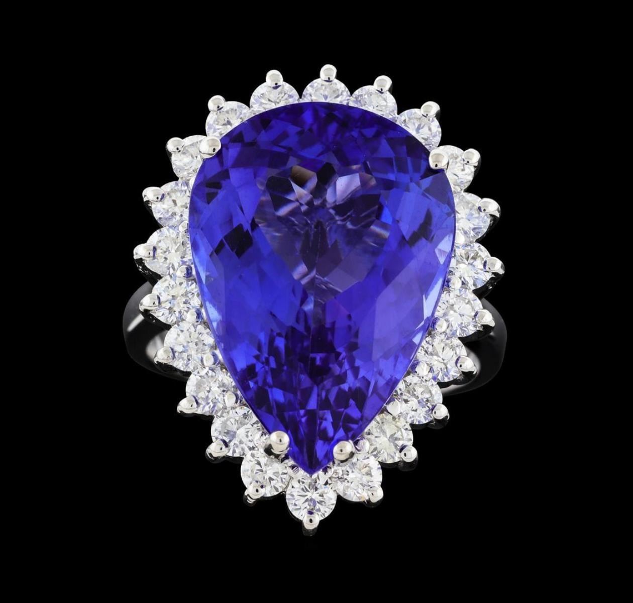 One electronically tested 14KT white gold lady's cast fashion ring with a basket halo with a bright polish finish. The featured lady's ring has a shank measuring 2.82 millimeters wide. Identified with markings of 'K14'. Condition is new, good workmanship. Containing: One prong set pear modified brilliant cut natural tanzanite, measuring 18.98 x 13.30 x 7.50mm, (depth est.) approximate weight of 12.77ct., clarity is eye clean, medium dark, strong, violetish blue color, (GIA vB 6/5), cut is very good. Transmitting light with no distortion, transparent. Colored gemstones are presumed to have been subjected to commonly used enhancement processes. Graded in the setting. Twenty-Two prong set round brilliant cut diamonds, measuring 2.60 - 2.50 x 1.56mm (depth est.) approximate total weight of 22 Stones = 1.36ct. Graded in the setting. Clarity SI-1 to I-1. Color: G - I Cut Good. Total Weight of Colored Stones 12.77ct.. Total Weight of Diamonds 1.36ct.. Total Weight of Ring 10.00gm. GAS Appraised.