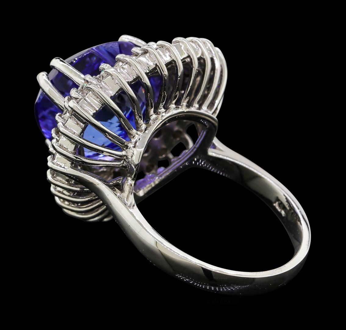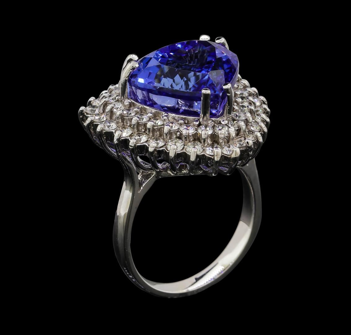 One electronically tested 14KT white gold lady's cast fashion ring with a double basket halo with a bright polish finish. The featured lady's ring has a shank measuring 2.60 millimeters wide. Identified with markings of 'K14'. Condition is new, good workmanship. Containing: One prong set heart modified brilliant cut natural tanzanite, measuring 13.60 x 13.75 x 10.13mm, (depth est.) 4%. bulge factor, approximate weight of 12.81ct., clarity is eye clean, medium dark, moderately strong, violetish blue color, (GIA vB 6/4), cut is good. Transmitting light with no distortion, transparent. Colored gemstones are presumed to have been subjected to commonly used enhancement processes. Graded in the setting. Twenty-Seven prong set round brilliant cut diamonds, measuring 2.10 - 2.00 x 1.25mm (depth est.) approximate total weight of 27 Stones = 0.86ct. Graded in the setting. Clarity SI-1 to SI-2. Color: H - I Cut Good Twenty-Four prong set round brilliant cut diamonds, measuring 1.90 - 1.80 x 1.15mm (depth est.) approximate total weight of 24 Stones = 0.58ct. Graded in the setting. Clarity SI-1 to SI-2. Color: G - I Cut Good. Total Weight of Colored Stones 12.81ct.. Total Weight of Diamonds 1.44ct.. Total Weight of Ring 11.80gm. GAS Appraised at $21,530.00.