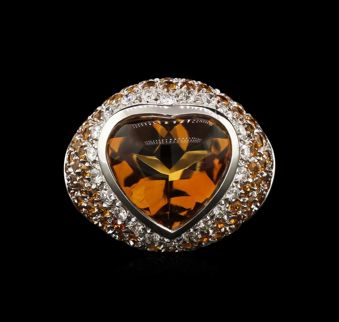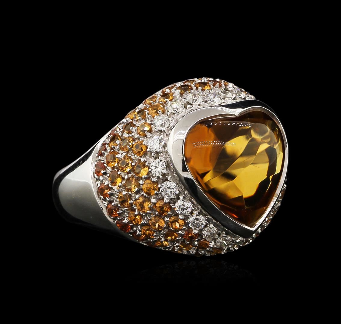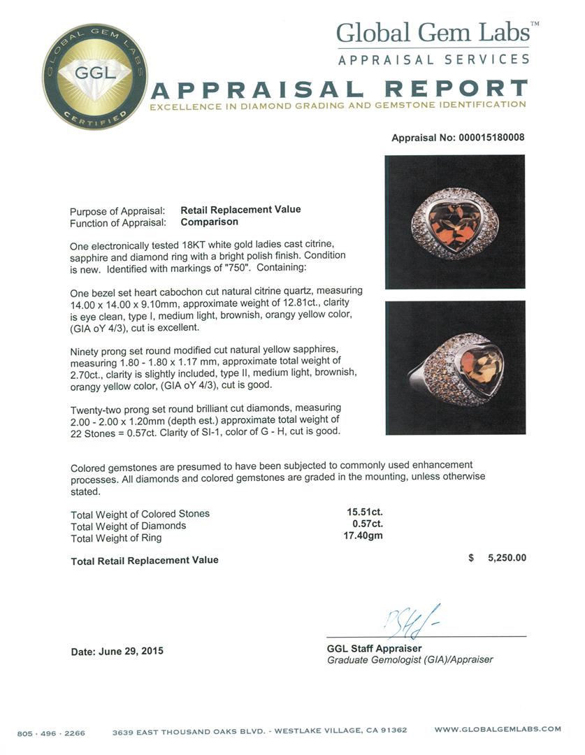 One electronically tested 18KT white gold ladies cast citrine, sapphire and diamond ring with a bright polish finish. Identified with markings of "750". Condition is new. Containing: One bezel set heart cabochon cut natural citrine quartz, measuring 14.00 x 14.00 x 9.10mm, approximate weight of 12.81ct., clarity is eye clean, type I, medium light, brownish, orangy yellow color, (GIA oY 4/3), cut is excellent. Ninety prong set round modified cut natural yellow sapphires, measuring 1.80 - 1.80 x 1.17 mm, approximate total weight of 2.70ct., clarity is slightly included, type II, medium light, brownish, orangy yellow color, (GIA oY 4/3), cut is good. Twenty-Two prong set round brilliant cut diamonds, measuring 2.00 - 2.00 x 1.20mm (depth est.) approximate total weight of 22 Stones = 0.57ct. Clarity: SI-1. Color: G - H, Cut is Good. Colored gemstones are presumed to have been subjected to commonly used enhancement processes. All diamonds and colored gemstones are graded in the mounting, unless otherwise stated. Total Weight of Colored Stones 15.51ct. Total Weight of Diamonds 0.57ct. Total Weight of Ring 17.40 grams. GGL Appraised at $5,250.00.