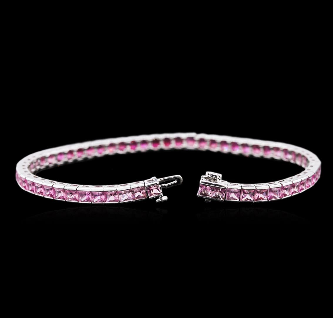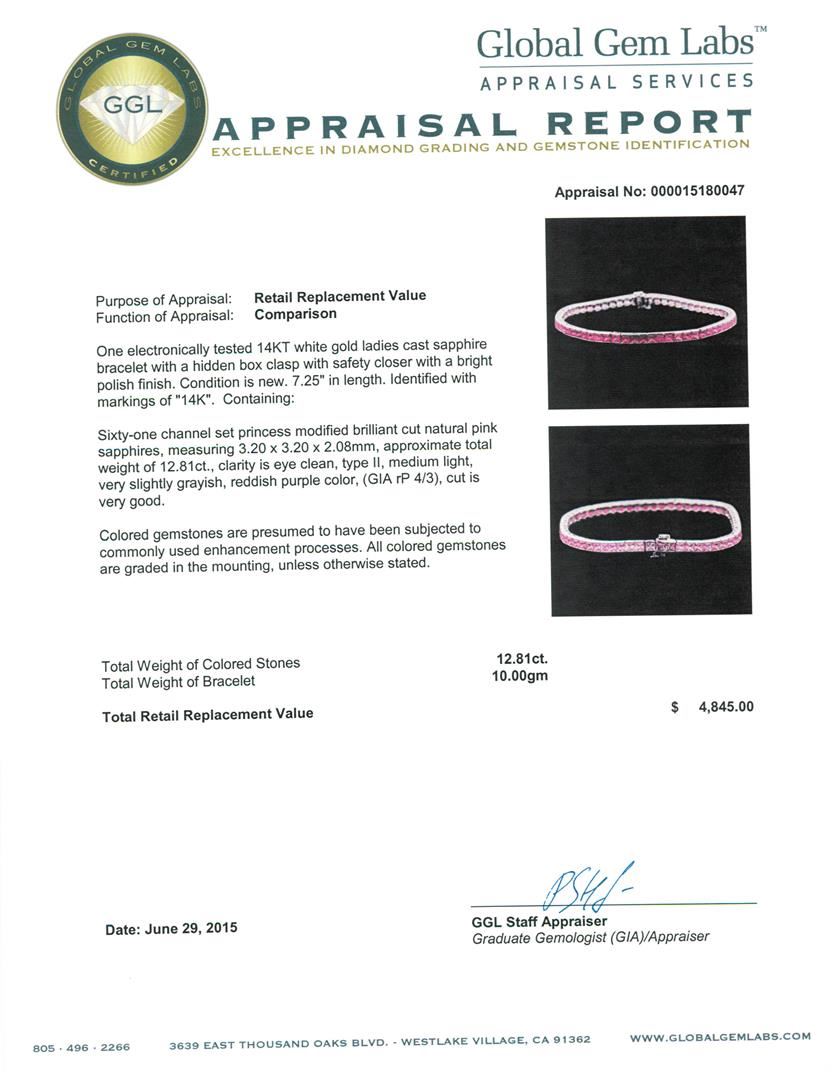 One electronically tested 14KT white gold ladies cast sapphire bracelet with a hidden box clasp with safety closer with a bright polish finish. 7.25" in length. Identified with markings of "14K". Condition is new. Containing: Sixty-one channel set princess modified brilliant cut natural pink sapphires, measuring 3.20 x 3.20 x 2.08mm, approximate. Total Weight of 12.81ct., clarity is eye clean, type II, medium light, very slightly grayish, reddish purple color, (GIA rP 4/3), cut is very good. Colored gemstones are presumed to have been subjected to commonly used enhancement processes. All colored gemstones are graded in the mounting, unless otherwise stated.Total Weight of Colored Stones 12.81ct. Total Weight of Bracelet 10.00 grams. GGL Appraised at $4,845.00.