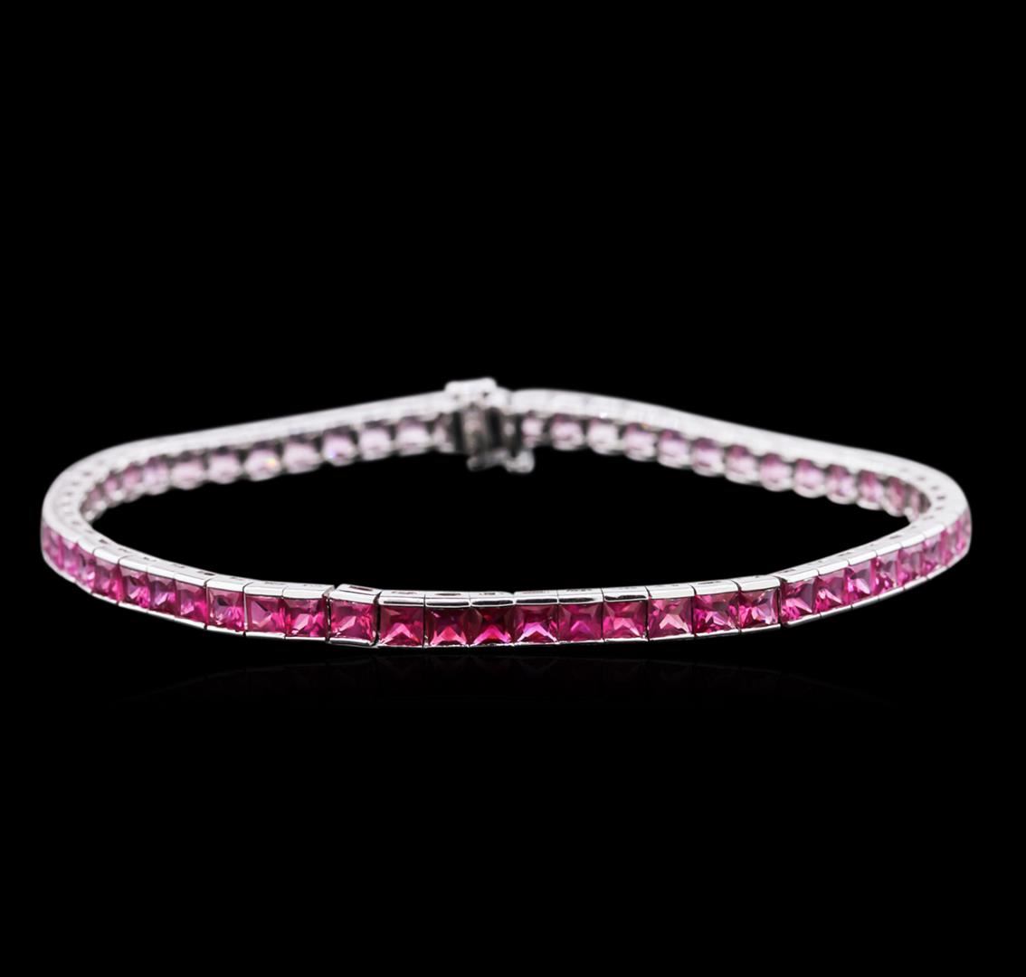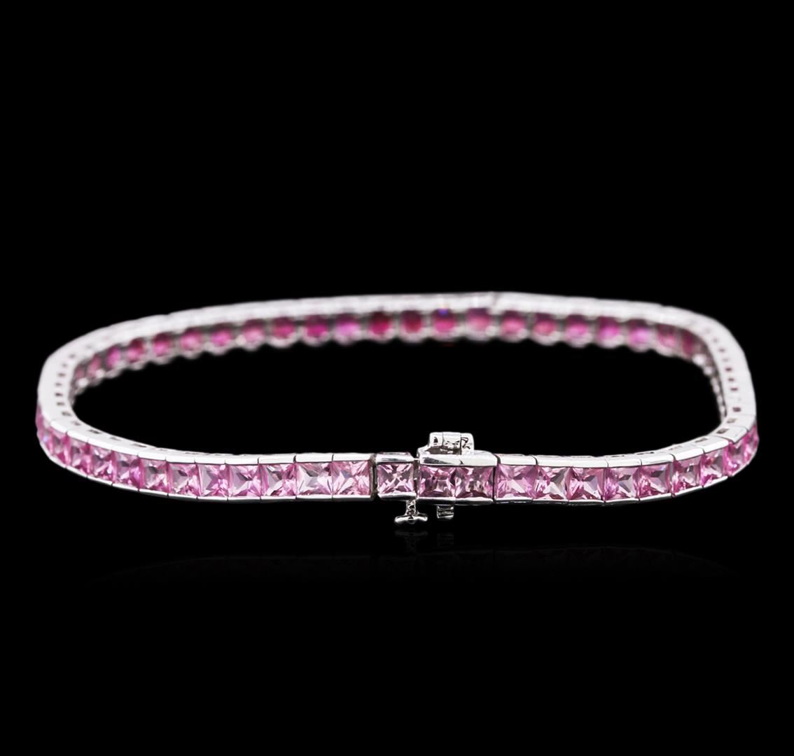 One electronically tested 14KT white gold ladies cast sapphire bracelet with a hidden box clasp with safety closer with a bright polish finish. 7.25" in length. Identified with markings of "14K". Condition is new. Containing: Sixty-one channel set princess modified brilliant cut natural pink sapphires, measuring 3.20 x 3.20 x 2.08mm, approximate. Total Weight of 12.81ct., clarity is eye clean, type II, medium light, very slightly grayish, reddish purple color, (GIA rP 4/3), cut is very good. Colored gemstones are presumed to have been subjected to commonly used enhancement processes. All colored gemstones are graded in the mounting, unless otherwise stated.Total Weight of Colored Stones 12.81ct. Total Weight of Bracelet 10.00 grams. GGL Appraised at $4,845.00.