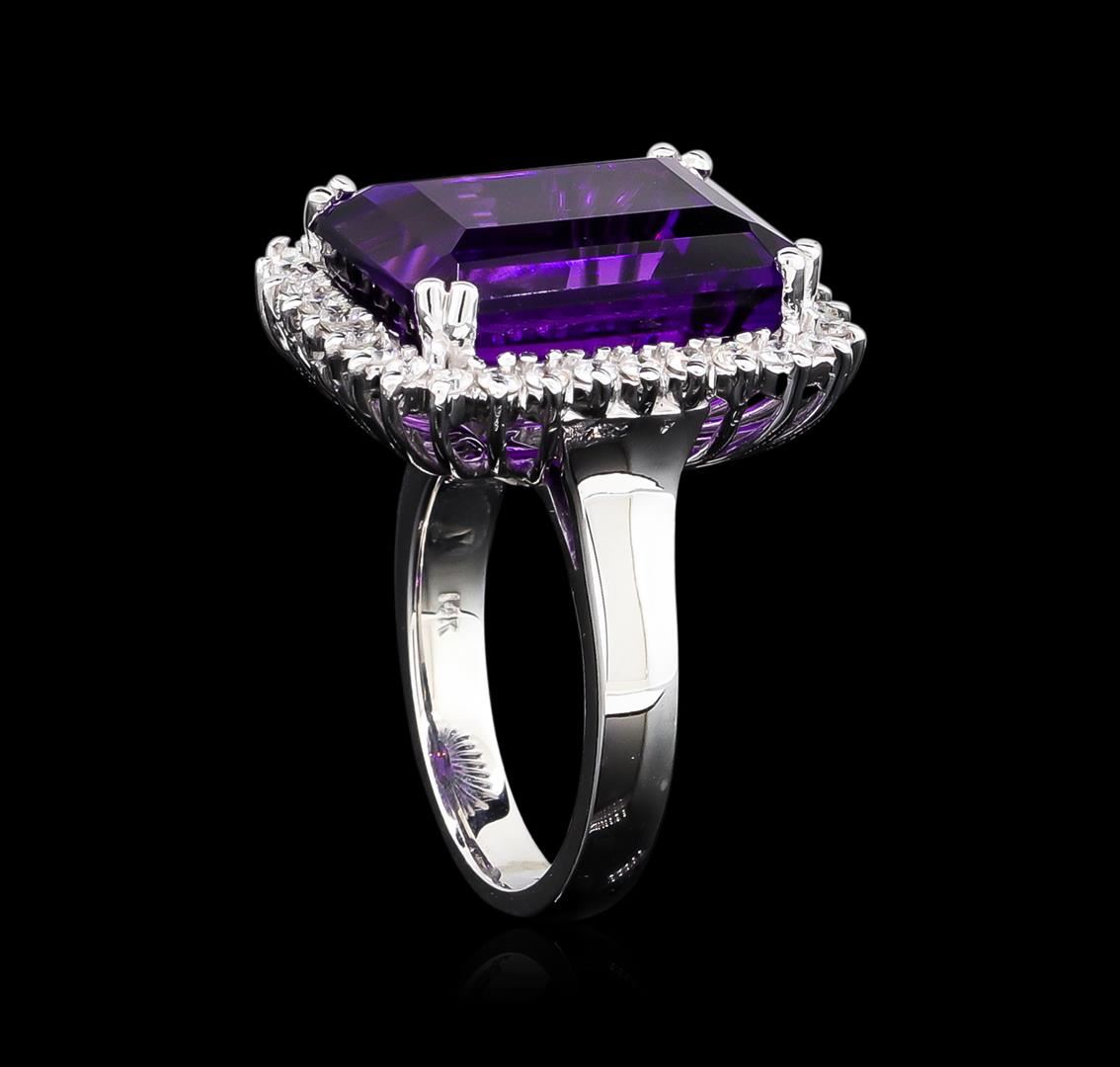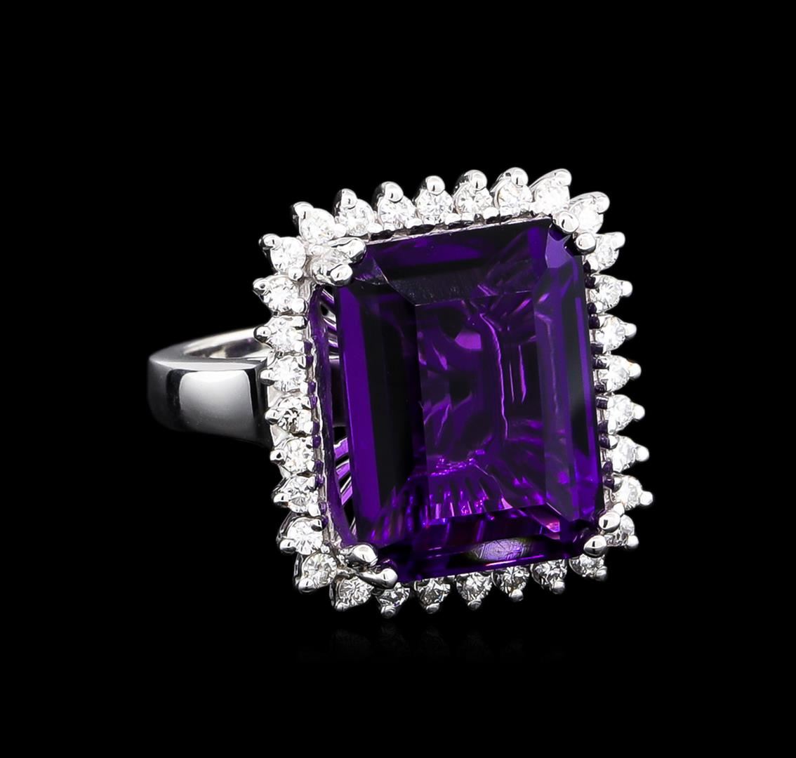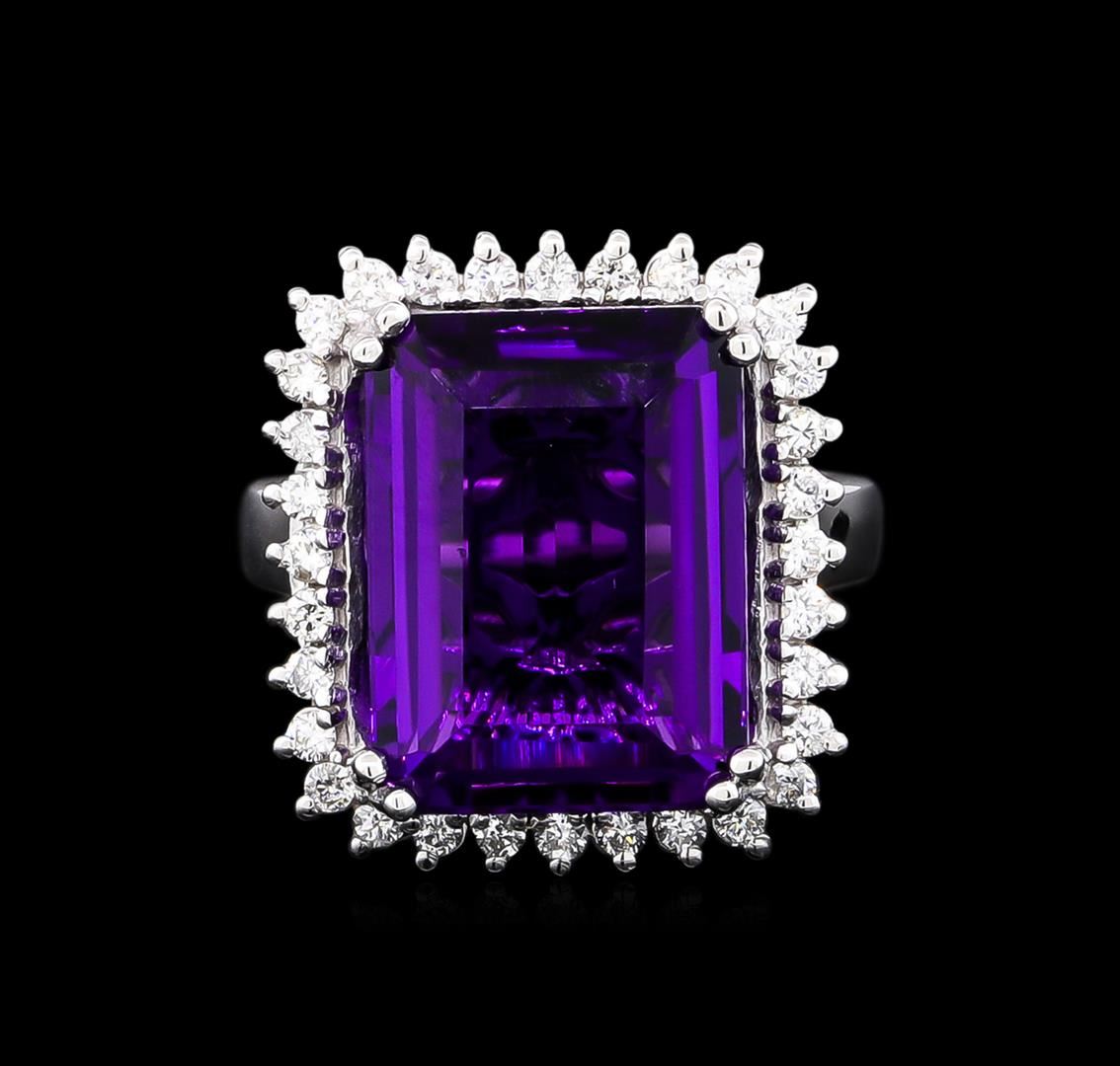 One electronically tested 14KT white gold lady's cast fashion ring with a basket halo with a bright polish finish. The featured lady's ring has a shank measuring 3.11 millimeters wide. Identified with markings of "14K". Condition is new, good workmanship. Containing: One prong set emerald modified step cut natural amethyst, measuring 16.17 x 12.14 x 7.72mm, 18%. bulge factor, approximate weight of 12.82ct., clarity is eye clean, type II, medium dark, moderately strong, purple color, (GIA P 6/4), cut is good. Transmitting light with no distortion, transparent. Colored gemstones are presumed to have been subjected to commonly used enhancement processes. Graded in the setting. Thirty-Two prong set round brilliant cut diamonds, measuring 1.70 - 1.65 x 1.04mm (depth est.) approximate total weight of 32 Stones = 0.58ct. Graded in the setting. Clarity: SI-1 to SI-2. Color: H - I. Cut Good. Total Weight of Colored Stones 12.82ct. Total Weight of Diamonds 0.58ct. Total Weight of Ring 12.10gm. GAS Appraised at $4,305.00.