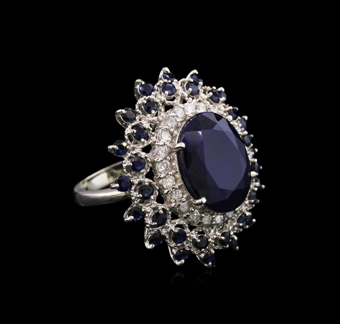 One electronically tested white gold ladies cast sapphire and diamond ring with a bright and milgrain finish. Condition is new, good workmanship. The featured sapphire is set within an inner diamond bezel and outer floral sapphire lattice gallery, completed by a three millimeter wide band. Identified with markings of "KM". Containing: One prong set oval mixed cut natural blue sapphire, measuring 15.10 x 12.00 x 6.50mm, 8% bulge factor, approximate weight of 11.15ct., clarity is severely included, type II, medium dark, moderately strong, violetish blue color, (GIAvB 6/4), cut is good. Transmitting light very diffusely, opaque. Naturally occurring internal & external characteristics are present. Indications of multiple laboratory enhancements, including high temperature heat treatment and diffusion treatment. Graded in the setting. Thirty-two prong set round brilliant cut natural blue sapphires, measuring 2.20 - 2.10 x 1.40 mm, approximate total weight of 1.70ct., clarity is eye clean, type II, medium dark, moderately strong, violetish blue color, (GIAvB 6/4), cut is good. Transmitting light with no distortion, transparent. Partial color zoning present. Color grade is an average for the group. Graded in the setting. Twenty-two prong set round brilliant cut diamonds, measuring 2.10 - 2.10 x 1.26mm (depth est.) approximate total weight of 22 Stones = 0.84ct. Graded in the setting. Clarity: I-1 to I-2.Color: G - I. AIG Appraised at $5,845.00.