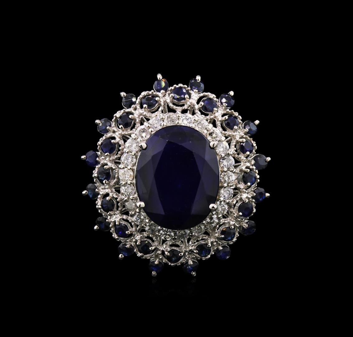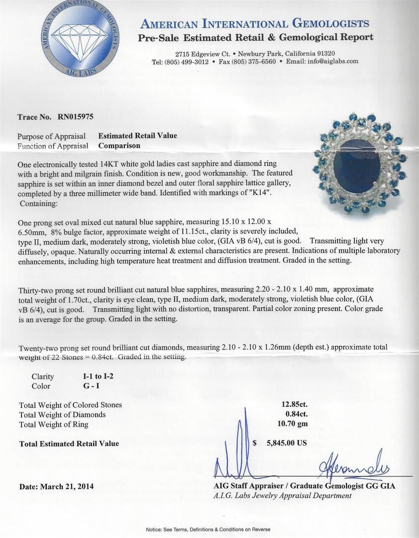 One electronically tested white gold ladies cast sapphire and diamond ring with a bright and milgrain finish. Condition is new, good workmanship. The featured sapphire is set within an inner diamond bezel and outer floral sapphire lattice gallery, completed by a three millimeter wide band. Identified with markings of "KM". Containing: One prong set oval mixed cut natural blue sapphire, measuring 15.10 x 12.00 x 6.50mm, 8% bulge factor, approximate weight of 11.15ct., clarity is severely included, type II, medium dark, moderately strong, violetish blue color, (GIAvB 6/4), cut is good. Transmitting light very diffusely, opaque. Naturally occurring internal & external characteristics are present. Indications of multiple laboratory enhancements, including high temperature heat treatment and diffusion treatment. Graded in the setting. Thirty-two prong set round brilliant cut natural blue sapphires, measuring 2.20 - 2.10 x 1.40 mm, approximate total weight of 1.70ct., clarity is eye clean, type II, medium dark, moderately strong, violetish blue color, (GIAvB 6/4), cut is good. Transmitting light with no distortion, transparent. Partial color zoning present. Color grade is an average for the group. Graded in the setting. Twenty-two prong set round brilliant cut diamonds, measuring 2.10 - 2.10 x 1.26mm (depth est.) approximate total weight of 22 Stones = 0.84ct. Graded in the setting. Clarity: I-1 to I-2.Color: G - I. AIG Appraised at $5,845.00.
