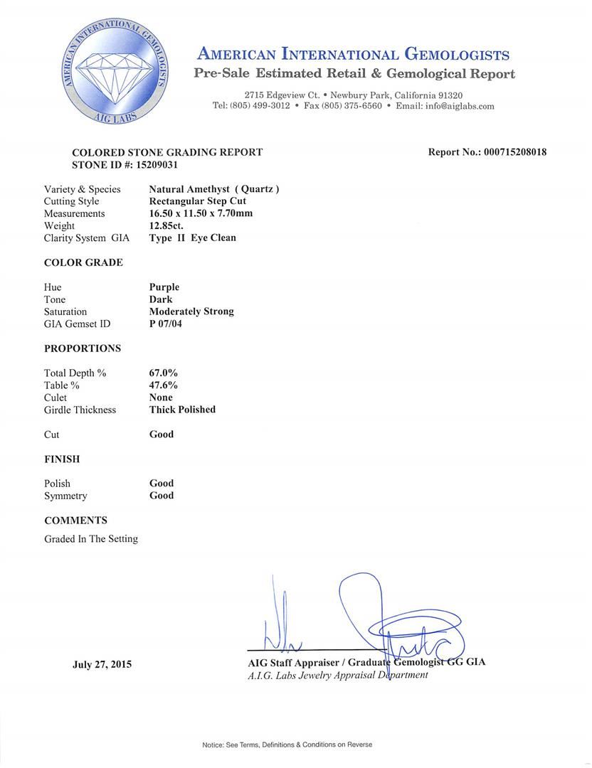 One electronically tested 14KT white gold ladies cast amethyst and diamond ring with a bright polish finish. The featured amethyst is set within a diamond bezel supported by tapering lattice shoulders, completed by a grooved two and one-half millimeter wide band. Identified with markings of "14K". Condition is new, good workmanship. Containing: One prong set rectangular step cut natural amethyst, measuring 16.50 x 11.50 x 7.70mm, 8%. bulge factor, exact weight 12.85ct., clarity is eye clean, type II, dark, moderately strong, purple color, (GIA P 7/4), cut is good. Transmitting light with no distortion, transparent. Colored Stone Grading Report attached. Graded in the setting. Twenty-Four prong set round brilliant cut diamonds exact total weight 24 Stones = 1.23ct. Graded in the setting. Clarity: SI-1 to I-1. Color: G - I. Total Weight of Colored Stones 12.85ct. Total Weight of Diamonds 1.23ct. Total Weight of Ring 11.17gm. AIG Appraised at $5,365.00.