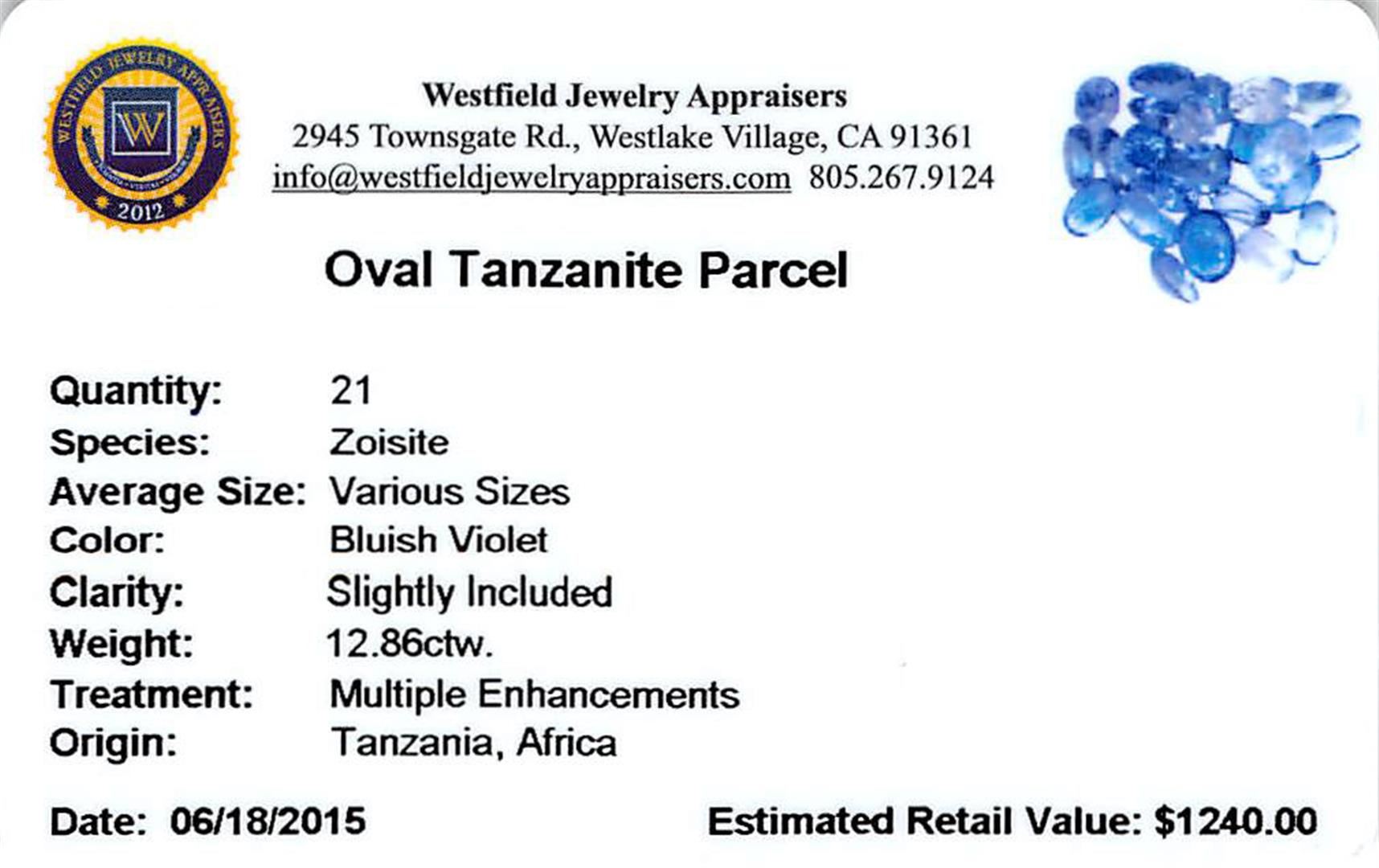 Twenty-one oval mixed cut natural tanzanites exact total weight 12.86ct., clarity is slightly included, type I, medium dark, very slightly grayish, bluish violet color, (GIA bV 6/3), cut is good. Transmitting light with a minimum of distortion, transparent. Naturally occurring internal & external characteristics are present. Color grade is an average for the group. Tanzanite is a very rare gemstone that is only found in the country of Tanzania. Originally discovered in 1967. Tiffany & Company, named the stone Tanzanite. It is found in the Usumburu Mountains that border the Umba Valley of northern Tanzania. Tanzanite occurs in gray, brown, violet, blue, reddish-purple, & green. The gem is interesting because of its exceptional pleochroism. Rotated in different directions a tanzanite will exhibit multiple changes of color. Tanzanite has a low tolerance to ultrasonic cleaning, and should not be cleaned using this method. Westfield Appraised at $1,240.00.