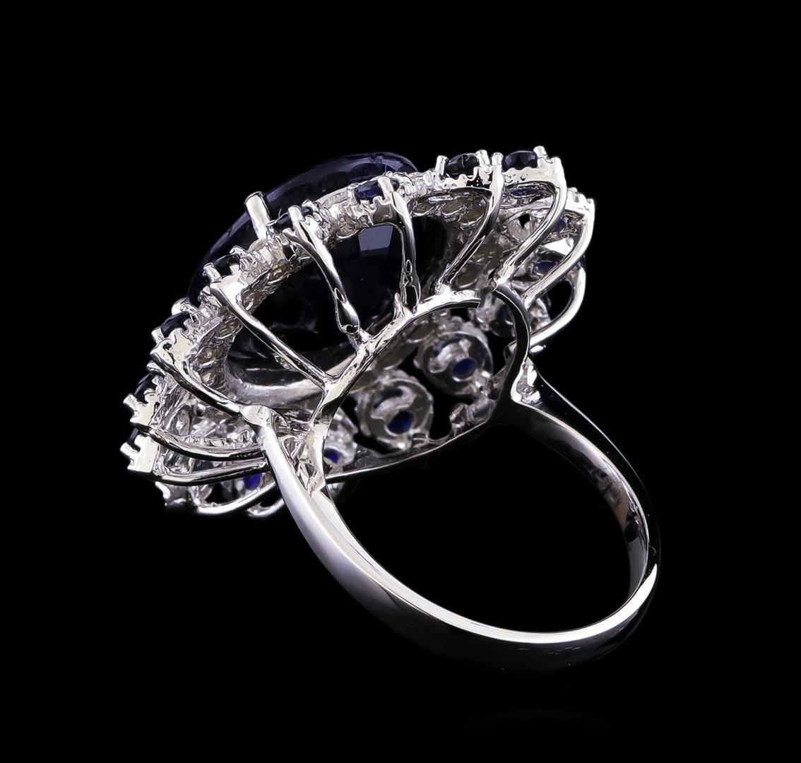 14K Gold Sapphire & Diamond Ring. One polished, stamped, and tested 14K white gold ring mounted with: 17 faceted sapphires weighing approximately 12.92 carats, and 23 faceted round diamonds weighing approximately 0.82 carats. This item weighs 10.1 grams, conditions is new, very good workmanship. Main Gemstones: Species: Natural Corundum. Variety: Sapphire. Shape: oval/round. Quantity: 17 Sapphires. Measurements: 15.2 x 13.0 mm (1 oval) 2.0 mm ( 16 round ). Total weight: 12.92 carats. Color: Dark blue. Cut grade: Very Good. Treatment: Fractured filled. Refractive index: 1.762-1.770 DR. Birefringence: 0.008-0.010. Hardness: 9. Adjacent Gemstones on Ring: Identity: Natural Diamond. Shape: Round. Cutting style: Brilliant Cut. Quantity: 23 Diamonds. Measurements: 2.0 mm. total weight: 0.82 carats. Clarity grade: SI2-I1. color Grade: G-H. Refractive index: 2.418. Hardness: 10. Gold content: 14K white gold. AIGL Appraised at $6,610.00.
