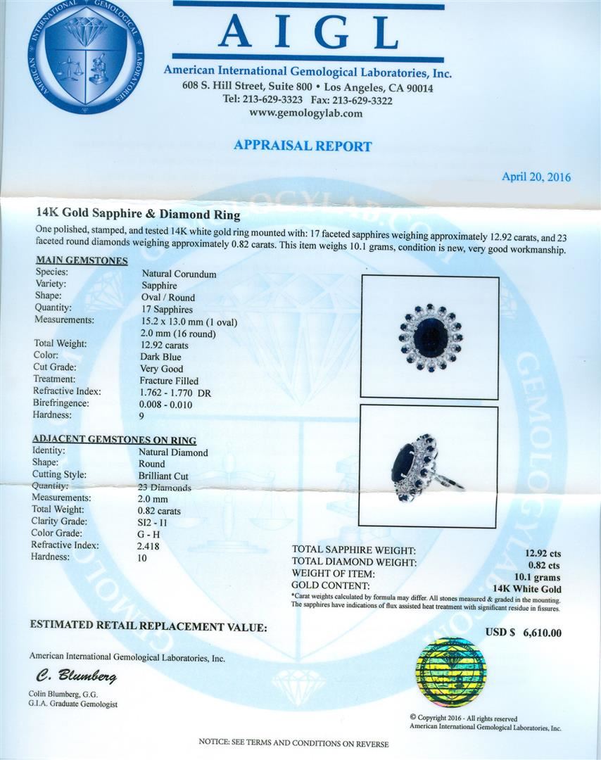 14K Gold Sapphire & Diamond Ring. One polished, stamped, and tested 14K white gold ring mounted with: 17 faceted sapphires weighing approximately 12.92 carats, and 23 faceted round diamonds weighing approximately 0.82 carats. This item weighs 10.1 grams, conditions is new, very good workmanship. Main Gemstones: Species: Natural Corundum. Variety: Sapphire. Shape: oval/round. Quantity: 17 Sapphires. Measurements: 15.2 x 13.0 mm (1 oval) 2.0 mm ( 16 round ). Total weight: 12.92 carats. Color: Dark blue. Cut grade: Very Good. Treatment: Fractured filled. Refractive index: 1.762-1.770 DR. Birefringence: 0.008-0.010. Hardness: 9. Adjacent Gemstones on Ring: Identity: Natural Diamond. Shape: Round. Cutting style: Brilliant Cut. Quantity: 23 Diamonds. Measurements: 2.0 mm. total weight: 0.82 carats. Clarity grade: SI2-I1. color Grade: G-H. Refractive index: 2.418. Hardness: 10. Gold content: 14K white gold. AIGL Appraised at $6,610.00.