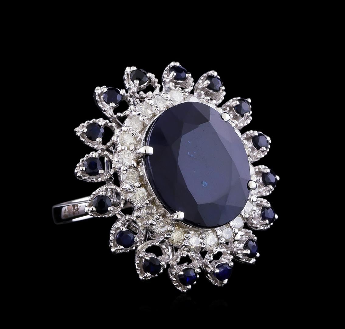 14K Gold Sapphire & Diamond Ring. One polished, stamped, and tested 14K white gold ring mounted with: 17 faceted sapphires weighing approximately 12.92 carats, and 23 faceted round diamonds weighing approximately 0.82 carats. This item weighs 10.1 grams, conditions is new, very good workmanship. Main Gemstones: Species: Natural Corundum. Variety: Sapphire. Shape: oval/round. Quantity: 17 Sapphires. Measurements: 15.2 x 13.0 mm (1 oval) 2.0 mm ( 16 round ). Total weight: 12.92 carats. Color: Dark blue. Cut grade: Very Good. Treatment: Fractured filled. Refractive index: 1.762-1.770 DR. Birefringence: 0.008-0.010. Hardness: 9. Adjacent Gemstones on Ring: Identity: Natural Diamond. Shape: Round. Cutting style: Brilliant Cut. Quantity: 23 Diamonds. Measurements: 2.0 mm. total weight: 0.82 carats. Clarity grade: SI2-I1. color Grade: G-H. Refractive index: 2.418. Hardness: 10. Gold content: 14K white gold. AIGL Appraised at $6,610.00.