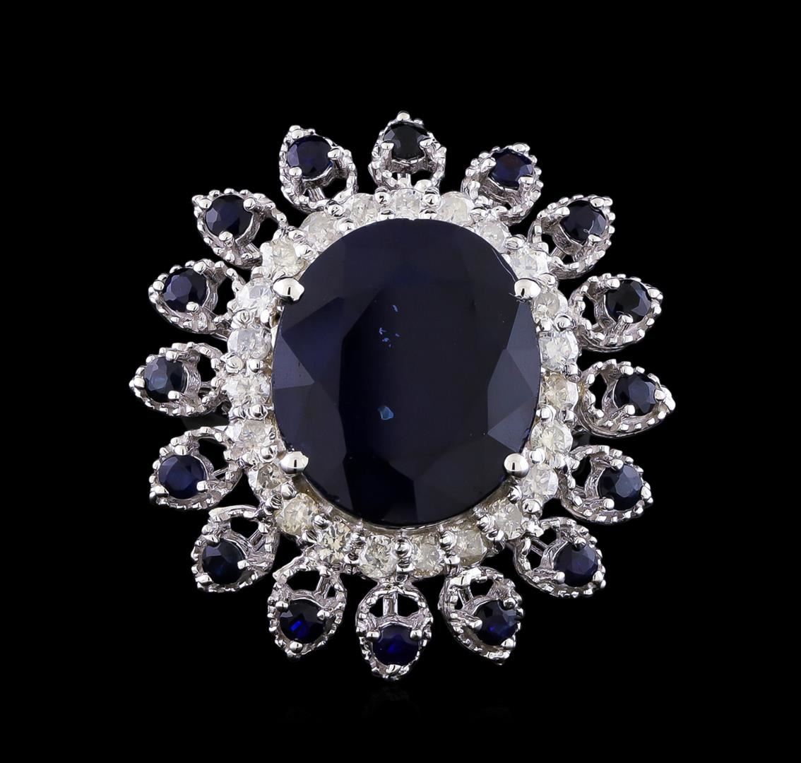 14K Gold Sapphire & Diamond Ring. One polished, stamped, and tested 14K white gold ring mounted with: 17 faceted sapphires weighing approximately 12.92 carats, and 23 faceted round diamonds weighing approximately 0.82 carats. This item weighs 10.1 grams, conditions is new, very good workmanship. Main Gemstones: Species: Natural Corundum. Variety: Sapphire. Shape: oval/round. Quantity: 17 Sapphires. Measurements: 15.2 x 13.0 mm (1 oval) 2.0 mm ( 16 round ). Total weight: 12.92 carats. Color: Dark blue. Cut grade: Very Good. Treatment: Fractured filled. Refractive index: 1.762-1.770 DR. Birefringence: 0.008-0.010. Hardness: 9. Adjacent Gemstones on Ring: Identity: Natural Diamond. Shape: Round. Cutting style: Brilliant Cut. Quantity: 23 Diamonds. Measurements: 2.0 mm. total weight: 0.82 carats. Clarity grade: SI2-I1. color Grade: G-H. Refractive index: 2.418. Hardness: 10. Gold content: 14K white gold. AIGL Appraised at $6,610.00.