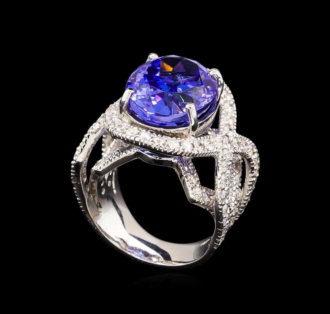 One electronically tested 14KT white gold lady's cast fashion ring with a crossover split shank with a bright polish with milgrain detailing finish. The featured lady's ring has a shank measuring 5.85 millimeters wide. Identified with markings of "K14". Condition is new, good workmanship. Containing: One prong set oval modified brilliant cut natural tanzanite, measuring 15.29 x 12.43 x 9.04mm, 7%. bulge factor, approximate weight of 12.92ct., clarity is eye clean, type I, medium dark, moderately strong, violetish blue color, (GIA vB 6/4), cut is good. Transmitting light with no distortion, transparent. Colored gemstones are presumed to have been subjected to commonly used enhancement processes. Graded in the setting. Eighty-Eight prong set round brilliant cut diamonds, measuring 1.85 - 1.75 x 1.10mm (depth est.) approximate total weight of 88 Stones = 1.90ct. Graded in the setting. Clarity: VS-2 to SI-2. Color: G - Good. Total Weight of Colored Stones 12.92ct. Total Weight of Diamonds 1.90ct. Total Weight of Ring 15.10gm. GAS Appraised at $30,265.00.