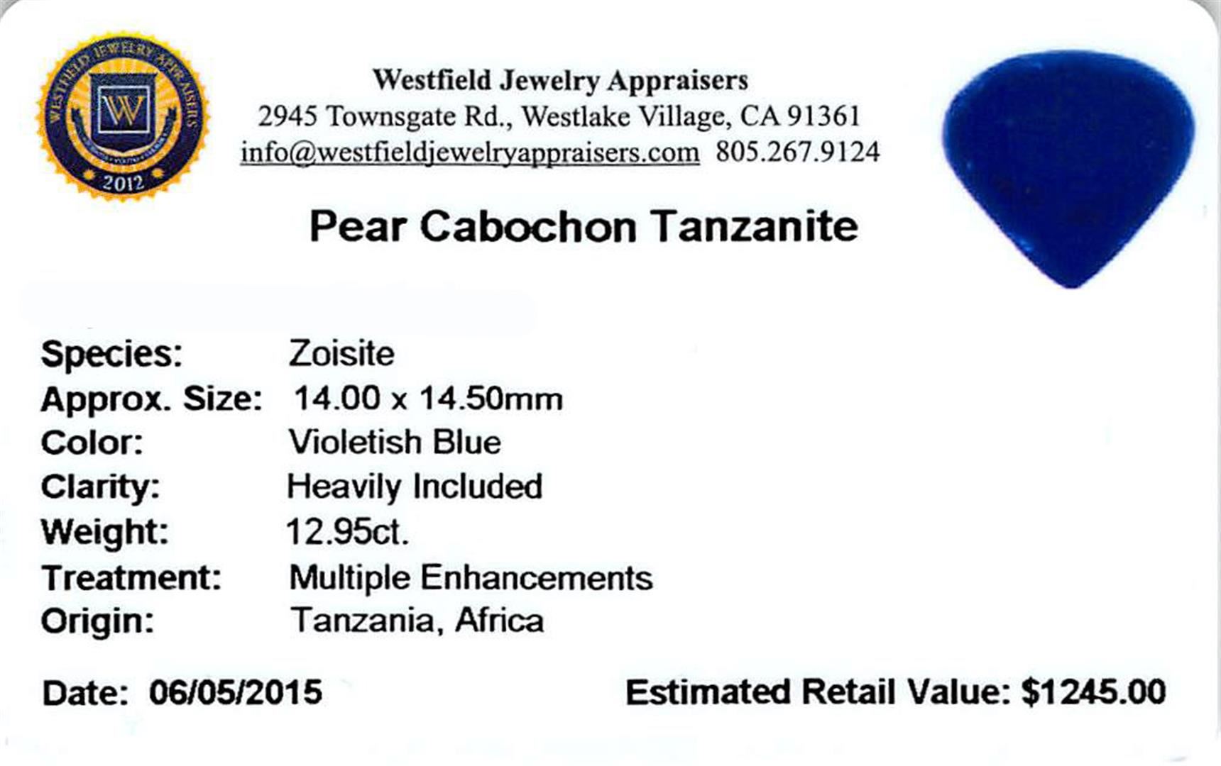One pear cabochon cut natural tanzanite, measuring 14.00 x 14.50 x 8.00mm, exact weight 12.95ct., clarity is heavily included, type I, dark, very slightly grayish, violetish blue color, (GIA vB 7/3), cut is good. Transmitting light somewhat diffusely, transparent to translucent. Naturally occurring internal & external characteristics are present. Tanzanite is a very rare gemstone that is only found in the country of Tanzania. Originally discovered in 1967. Tiffany & Company, named the stone Tanzanite. It is found in the Usumburu Mountains that border the Umba Valley of northern Tanzania. Tanzanite occurs in gray, brown, violet, blue, reddish-purple, & green. The gem is interesting because of its exceptional pleochroism. Rotated in different directions a tanzanite will exhibit multiple changes of color. Tanzanite has a low tolerance to ultrasonic cleaning, and should not be cleaned using this method. Westfield Appraised at $1,245.00.