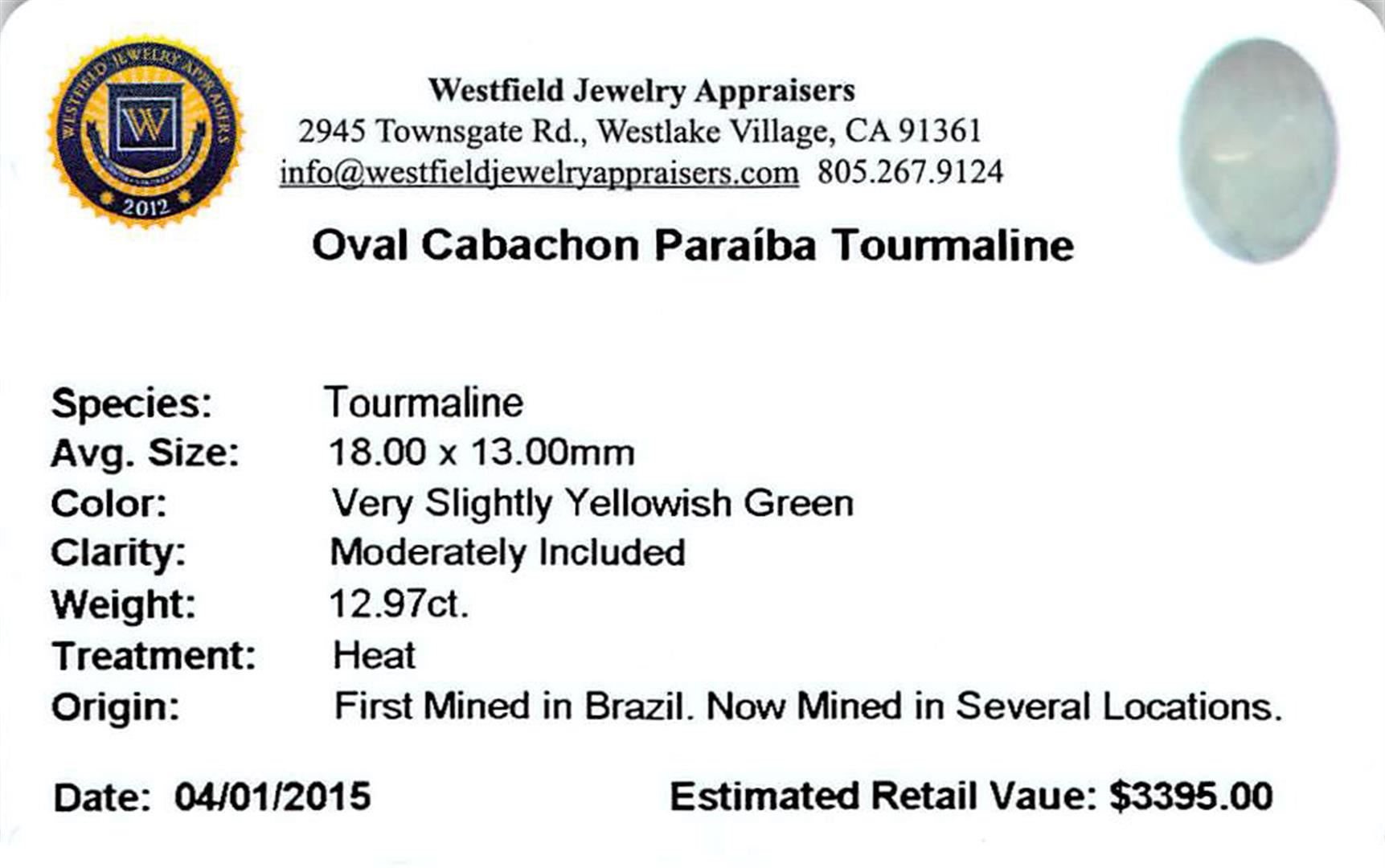 One oval cabochon cut natural Paraiba tourmaline exact weight 12.97ct., clarity is moderately included, cut is good. Westfield Appraised at $3,395.00.