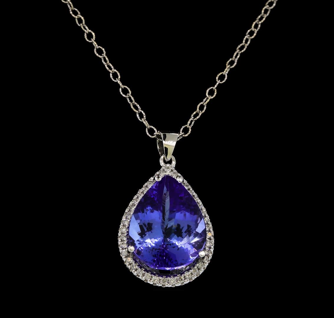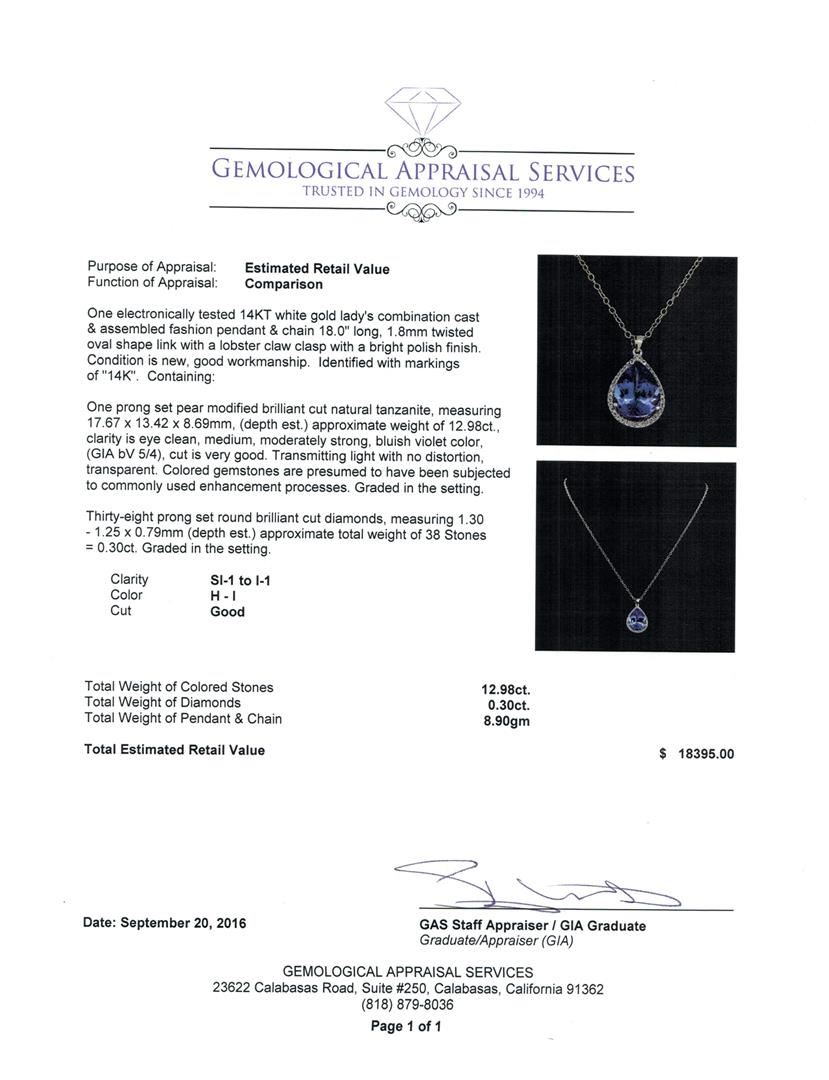 One electronically tested 14KT white gold lady's combination cast & assembled fashion pendant & chain 18.0' long, 1.8mm twisted oval shape link with a lobster claw clasp with a bright polish finish. Identified with markings of '14K'. Condition is new, good workmanship. Containing: One prong set pear modified brilliant cut natural tanzanite, measuring 17.67 x 13.42 x 8.69mm, (depth est.) approximate weight of 12.98ct., clarity is eye clean, medium, moderately strong, bluish violet color, (GIA bV 5/4), cut is very good. Transmitting light with no distortion, transparent. Colored gemstones are presumed to have been subjected to commonly used enhancement processes. Graded in the setting. Thirty-Eight prong set round brilliant cut diamonds, measuring 1.30 - 1.25 x 0.79mm (depth est.) approximate total weight of 38 Stones = 0.30ct. Graded in the setting. Clarity SI-1 to I-1. Color: H - I Cut Good. Total Weight of Colored Stones 12.98ct.. Total Weight of Diamonds 0.30ct.. Total Weight of Pendant & Chain 8.90gm. GAS Appraised at $18,395.00.