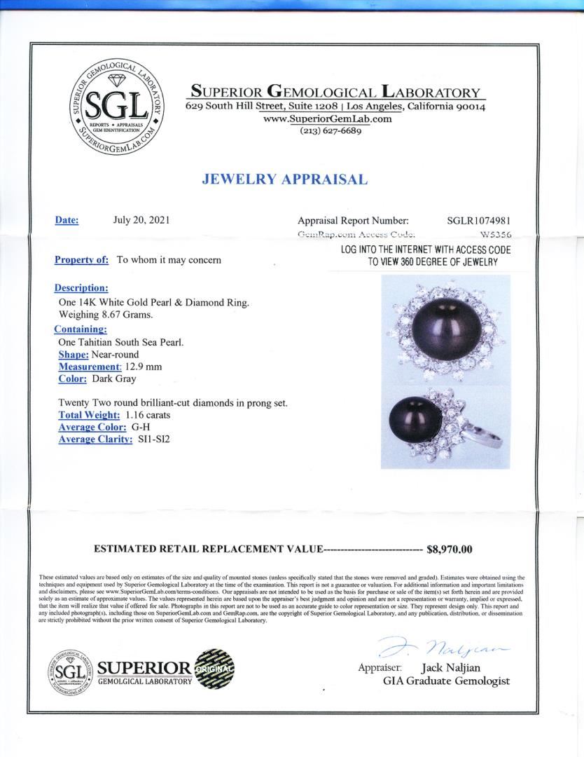 #Description:# One 14K White Gold Pearl and Diamond Ring. Weighing 8.67 Grams #Containing:# One Tahitian South Sea Pearl Shape: Near-round Measurement: 12.9mm Color: Dark Gray Twenty Two round brilliant-cut diamonds in prong set Total Weight: 1.16 carats Average Color: G-H Average Clarity: SI1 -SI2 #LREF-4483