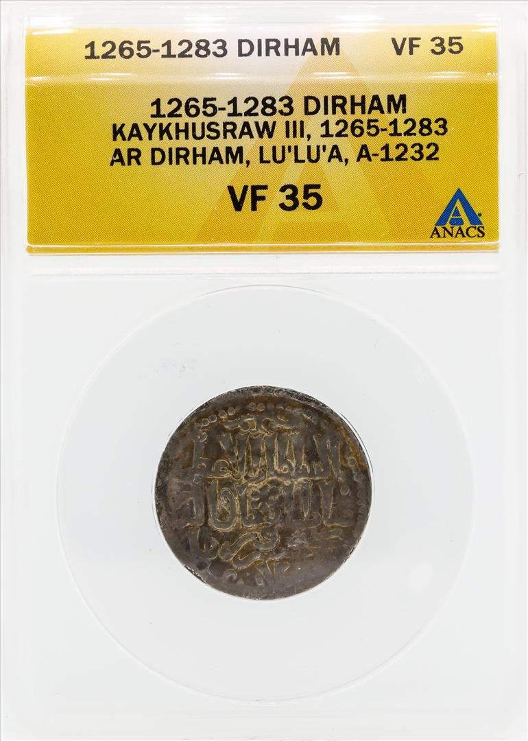 One 1265-1283 Dirham Kaykhusraw III Coin ANACS VF35. ANACS Appraised.