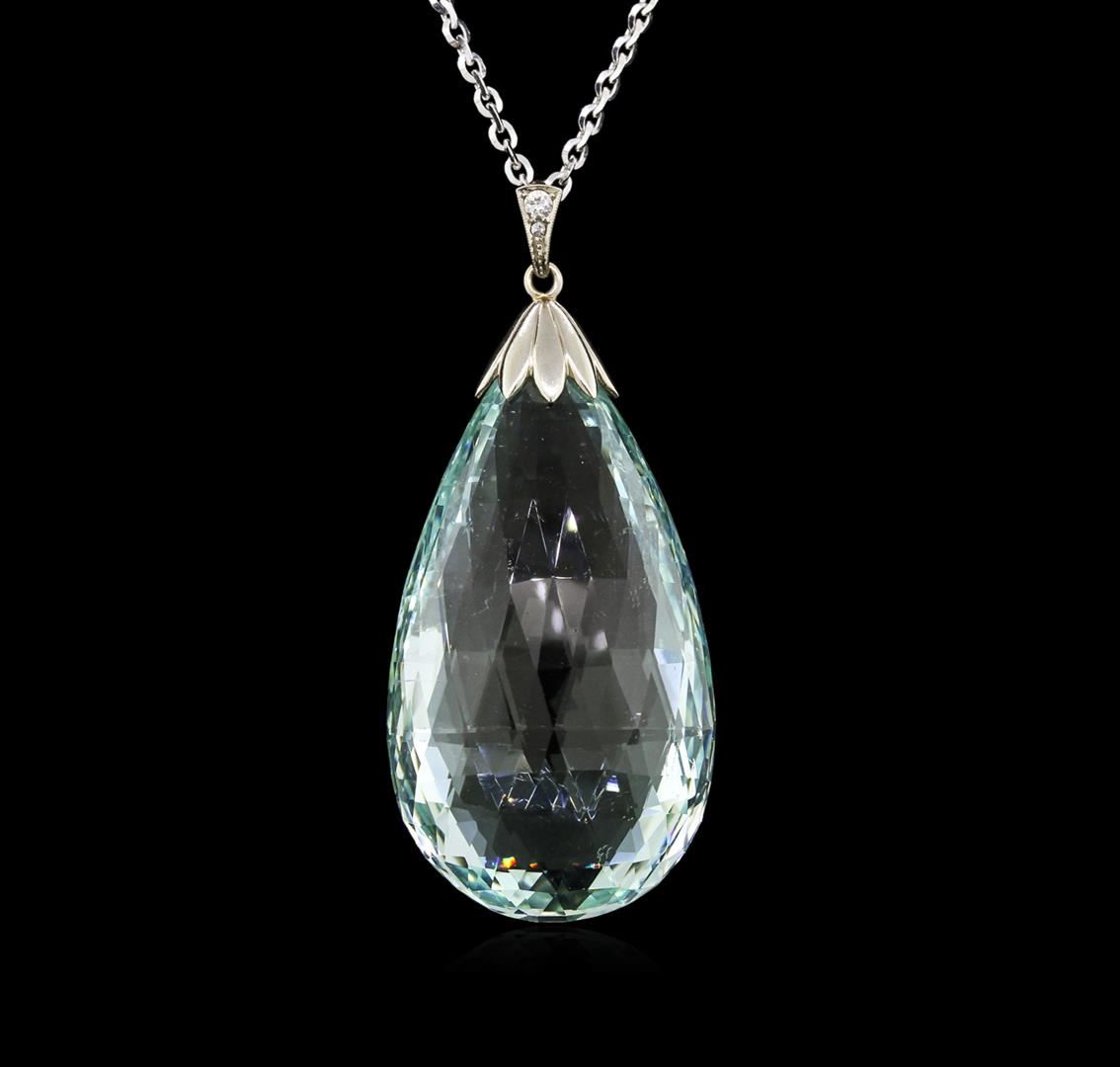 One electronically tested 14KT white gold lady's combination cast & assembled drop style pendant & chain 22.0" long, 1.4mm flat oval shape link with a lobster claw clasp with a bright polish finish. Identified with markings of "14K". Condition is new, good workmanship. Containing: One claw set briolette cut natural aquamarine, measuring 43.50 x 26.00 x 16.90mm, approximate weight of 127.00ct., clarity is eye clean, type I, medium light, very slightly grayish, very slightly greenish blue color, (GIA vslgB 4/3), cut is very good. Transmitting light with no distortion, transparent. Colored gemstones are presumed to have been subjected to commonly used enhancement processes. Graded in the setting. One bead set round brilliant cut diamond, measuring 2.50 - 2.45 x 1.49mm (depth est.) approximate weight of 0.06ct. Graded in the setting. Clarity: I-1. Color: Good One bead set old mine cut diamond, measuring 1.20 - 1.15 x 0.73mm (depth est.) approximate weight of 0.01ct. Graded in the setting. Clarity: I-1. Color: I. Cut Fair. Total Weight of Colored Stones127.00ct. Total Weight of Diamonds 0.06ct. Total Weight of Pendant & Chain 36.50gm. GAS Appraised at $12,410.00.