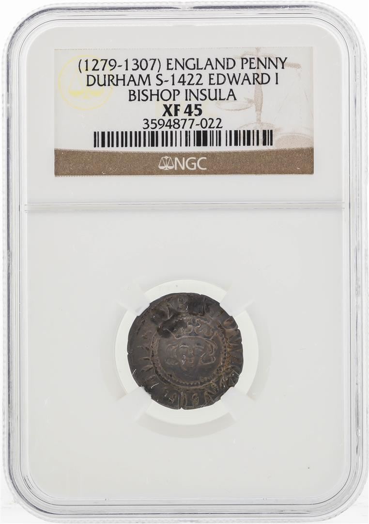 One 1279-1307 England Penny Durham S-1422 Edward I Bishop Insula Coin NGC XF45. NGC Certified.