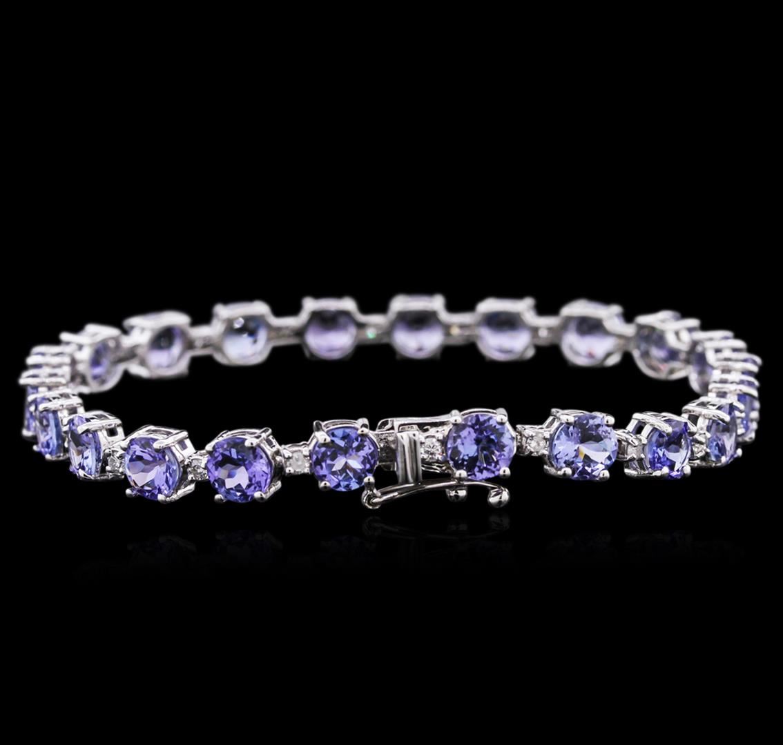 One electronically tested 14KT white gold ladies cast tanzanite and diamond bracelet with a hidden box clasp with safety closer with a bright polish finish. 7" in length. Identified with markings of "14K". Condition is new. Containing: Twenty-two prong set round modified brilliant cut natural tanzanites, measuring 5.50 - 5.50 x 3.58 mm, approximate. Total Weight of 13.00ct., clarity is eye clean, type I, medium light, very slightly grayish, violet color, (GIA V 4/3), cut is good. Colored gemstones are presumed to have been subjected to commonly used enhancement processes. All colored gemstones are graded in the mounting, unless otherwise stated.Twenty-Two prong set round brilliant cut diamonds, measuring 1.90 - 1.90 x 1.14mm (depth est.) approximate. Total Weight of 22 Stones = 0.55ct. Clarity: I-1 to I-2. Color: I - J, Cut is Good. Colored gemstones are presumed to have been subjected to commonly used enhancement processes. All diamonds and colored gemstones are graded in the mounting, unless otherwise stated. Total Weight of Colored Stones 13.00ct. Total Weight of Diamonds 0.55ct. Total Weight of Bracelet 11.70 grams. GGL Appraised at $4,965.00.