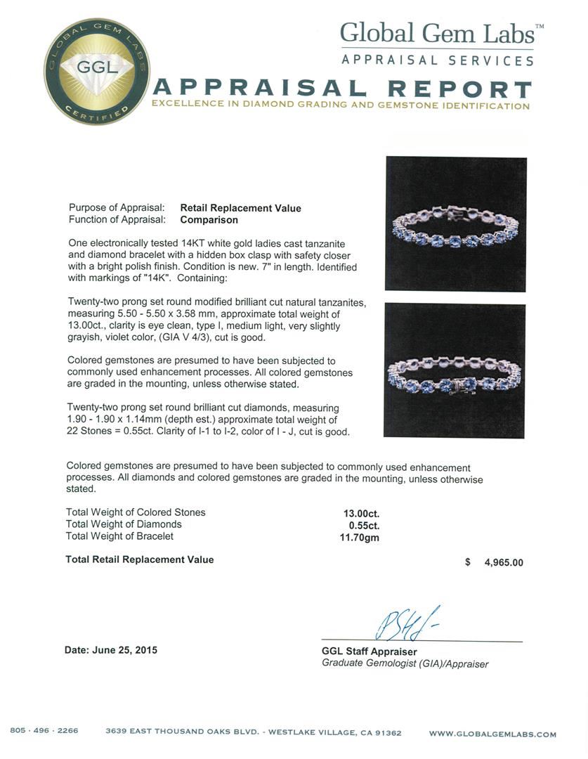 One electronically tested 14KT white gold ladies cast tanzanite and diamond bracelet with a hidden box clasp with safety closer with a bright polish finish. 7" in length. Identified with markings of "14K". Condition is new. Containing: Twenty-two prong set round modified brilliant cut natural tanzanites, measuring 5.50 - 5.50 x 3.58 mm, approximate. Total Weight of 13.00ct., clarity is eye clean, type I, medium light, very slightly grayish, violet color, (GIA V 4/3), cut is good. Colored gemstones are presumed to have been subjected to commonly used enhancement processes. All colored gemstones are graded in the mounting, unless otherwise stated.Twenty-Two prong set round brilliant cut diamonds, measuring 1.90 - 1.90 x 1.14mm (depth est.) approximate. Total Weight of 22 Stones = 0.55ct. Clarity: I-1 to I-2. Color: I - J, Cut is Good. Colored gemstones are presumed to have been subjected to commonly used enhancement processes. All diamonds and colored gemstones are graded in the mounting, unless otherwise stated. Total Weight of Colored Stones 13.00ct. Total Weight of Diamonds 0.55ct. Total Weight of Bracelet 11.70 grams. GGL Appraised at $4,965.00.