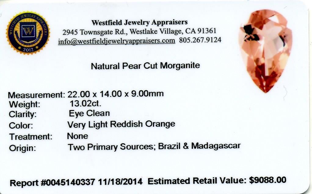 13.02ctw. Natural Pear Cut Morganite. Westfield Appraised at $9,088.00.