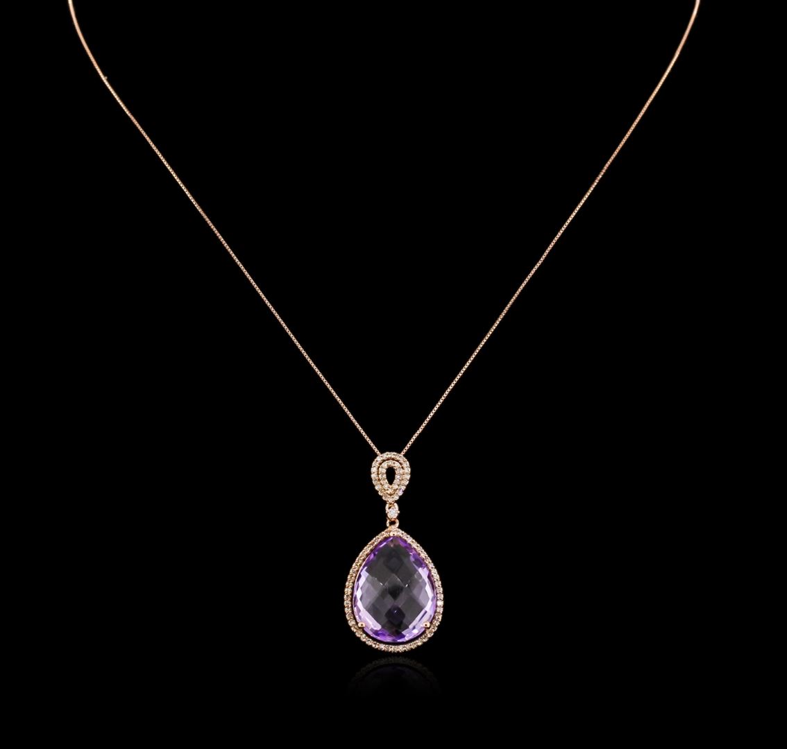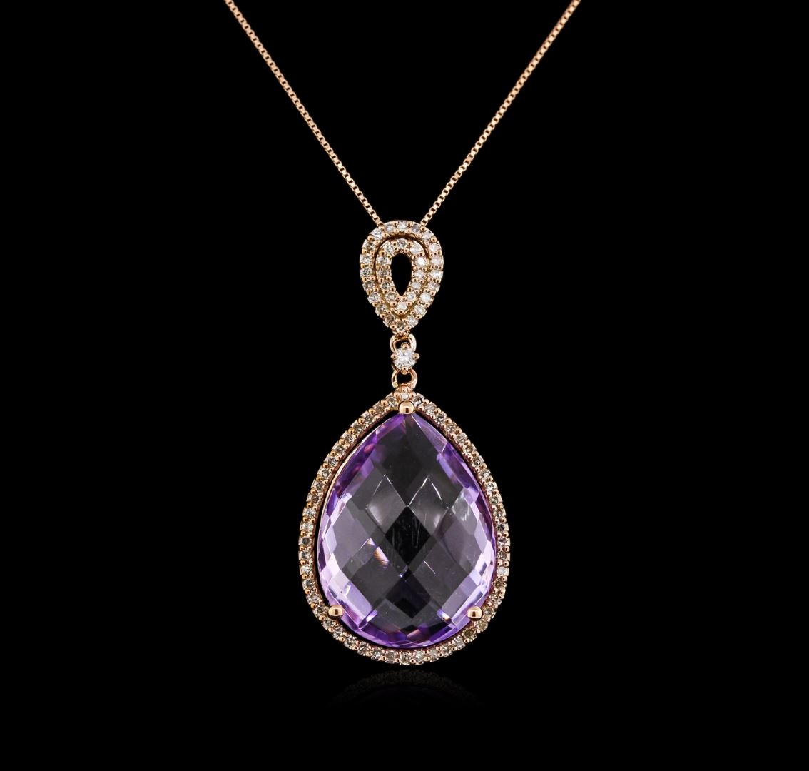 One pendant with chain featuring: 14KT rose gold weighing 7.80 grams containing one amethyst center stone with a total weight of 13.08ct and diamonds with a total weight of 0.42ct.