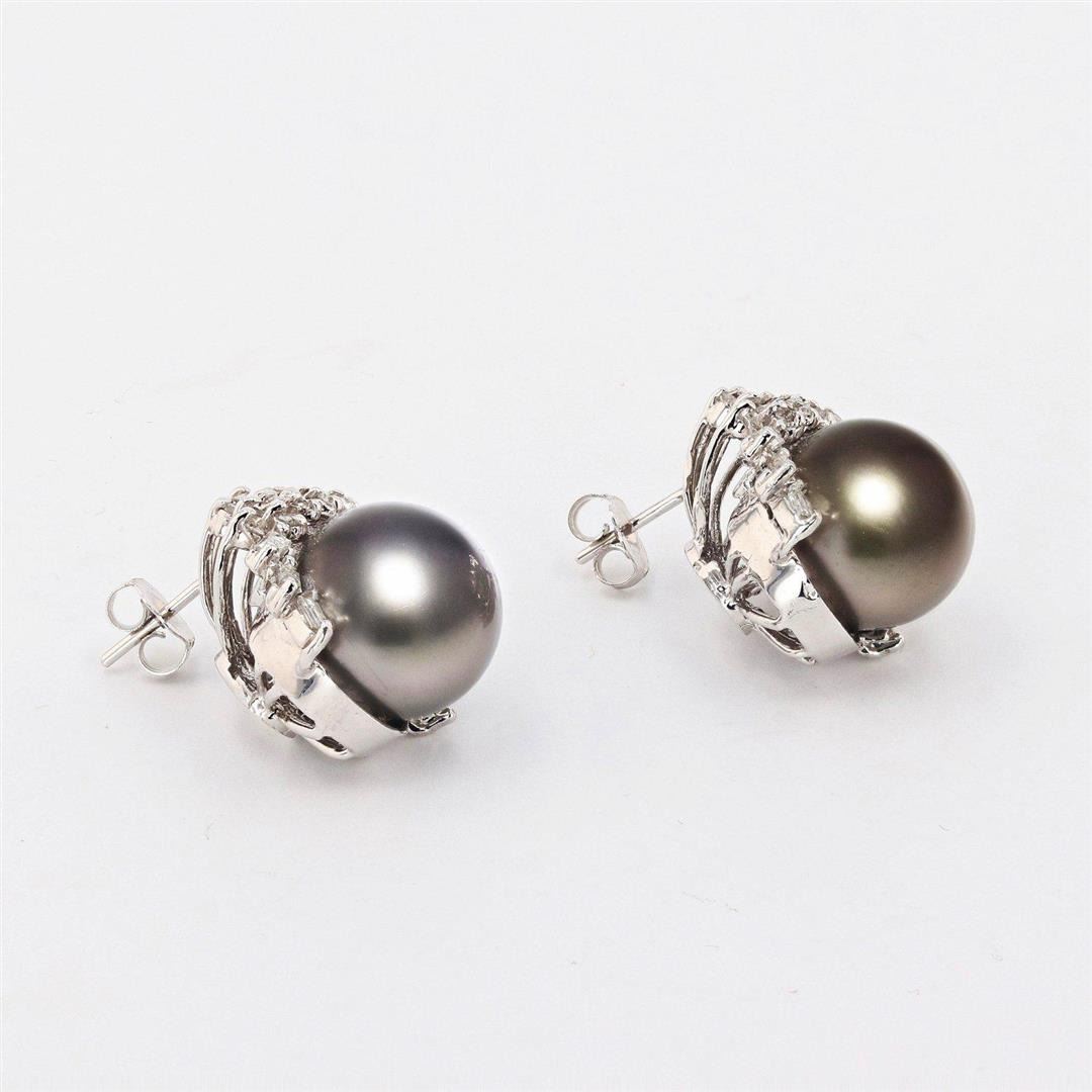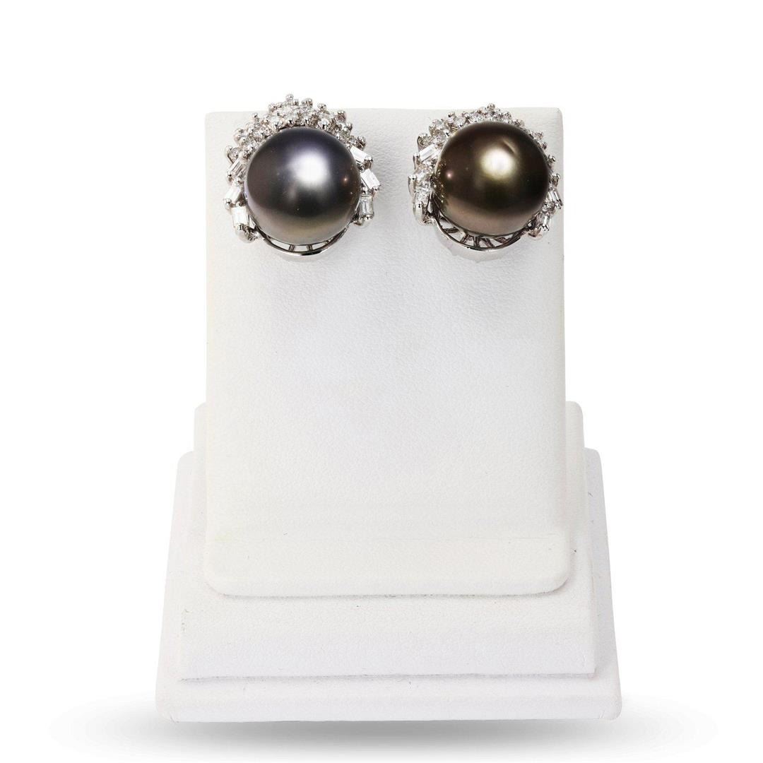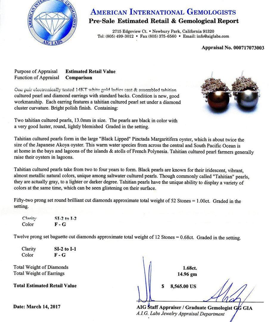 13.0mm Black Tahitian Cultured Pearl and 1.68ctw Diamond 14K White Gold Earrings. One pair eleetronically tested 14KT white gold ladies east and assembled tahitian cultured pearl and diamond earrings with standard backs. Condition is new, good workmanship. Each earring features a tahitian cultured pearl set under a diamond cluster curvature. Bright polish finish. Containing: Two tahitian cultured pearls, 13.0mm in size. The pearls are black in color with a very good luster, round, lightly blemished Graded in the setting. Tahitian cultured pearls form in the large "Black Lipped" Pinctada Margaritifera oyster, which is about twice the size of the Japanese Akoya oyster. This warm water species from across the central and South Pacific Ocean is at home in the bays and lagoons of the islands and atolls of French Polynesia. Tahitian cultured pearl farmers generally raise their oysters in lagoons. Tahitian cultured pearls take from two to four years to form. Black pearls are known for their iridescent, vibrant, almost metallic natural colors, unique among saltwater cultured pearls. Though commonly called "Tahitian" pearls, they are actually gray, to a lighter or darker degree. Tahitian pearls have the unique ability to display a variety of colors at the same time, which can be seen glistening on their surface. Fifty-two prong set round brilliant cut diamonds approximate total weight of 52 Stones = 1.00ct. Graded in the setting. Clarity SI2 to I2 Color F - G Twelve prong set baguette cut diamonds approximate total weight of 12 Stones = 0.68ct. Graded in the setting. Clarity SI2 to I1 Color F - G Total Weight of Diamonds 1.68ct.Total Weight of Earrings 14.96 gm