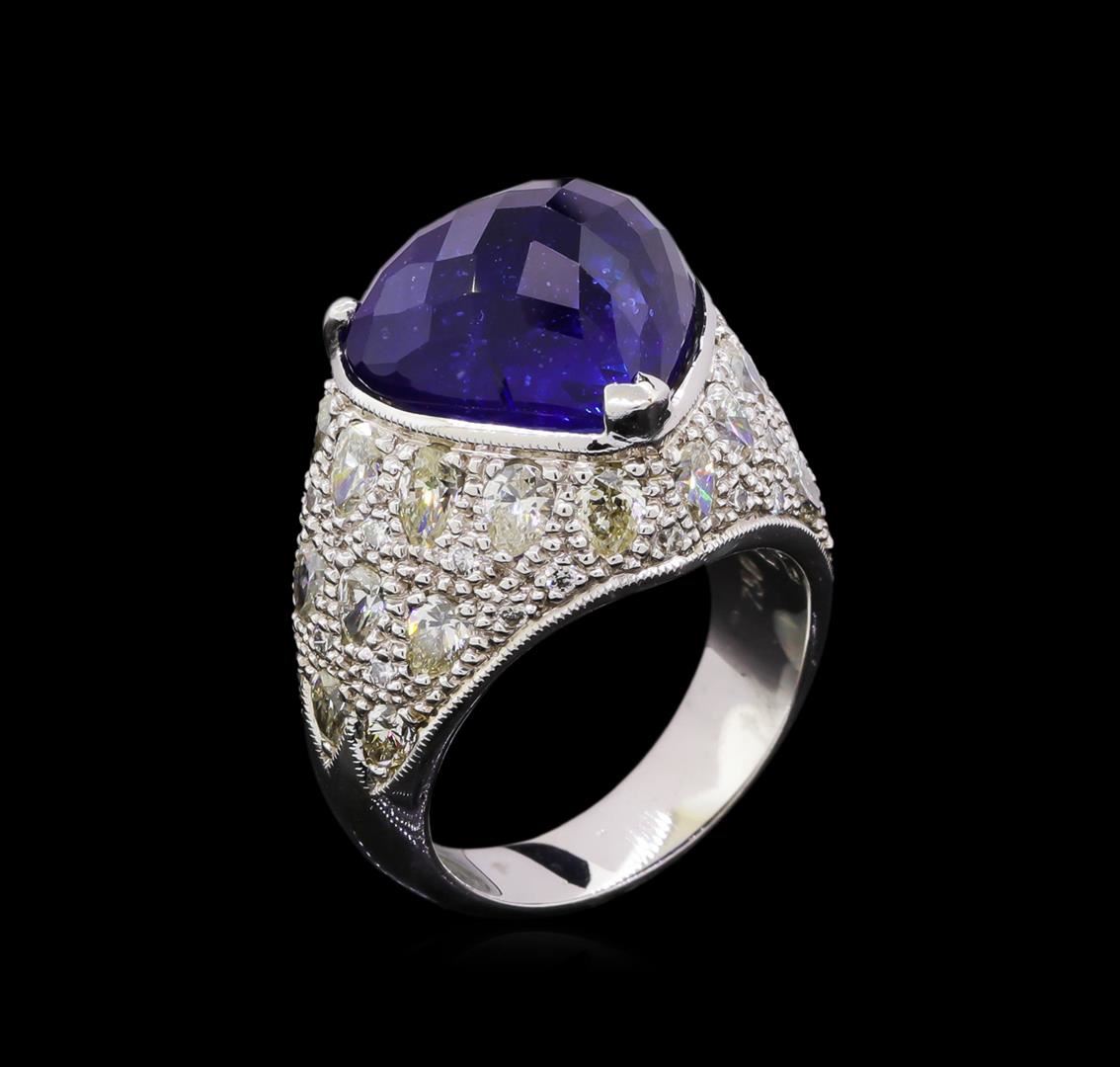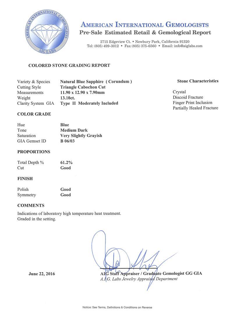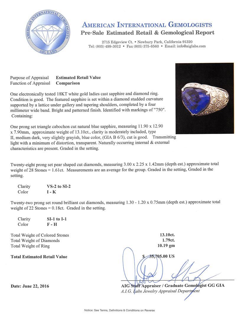 One electronically tested 18KT white gold ladies cast sapphire and diamond ring. The featured sapphire is set within a diamond studded curvature supported by a lattice under gallery and tapering shoulders, completed by a four millimeter wide band. Bright and patterned finish. Identified with markings of "750". Condition is good. Containing: One prong set triangle cabochon cut natural blue sapphire, measuring 11.90 x 12.90 x 7.90mm, approximate weight of 13.10ct., clarity is moderately included, type II, medium dark, very slightly grayish, blue color, (GIA B 6/3), cut is good. Transmitting light with a minimum of distortion, transparent. Naturally occurring internal & external characteristics are present. Graded in the setting. Twenty-Eight prong set pear shaped cut diamonds, measuring 3.00. x 2.25 x 1.42mm (depth est.) approximate total weight of 28 Stones = 1.61ct. Measurements are an average for the group. Graded in the setting, Graded in the setting. Clarity: VS-2 to SI-2 . Color: I - K Twenty-Two prong set round brilliant cut diamonds, measuring 1.30 - 1.20 x 0.75mm (depth est.) approximate total weight of 22 Stones = 0.18ct. Graded in the setting. Clarity: SI-1 to I-1 . Color: F - H. Total Weight of Colored Stones 13.10ct.. Total Weight of Diamonds 1.79ct.. Total Weight of Ring 10.19gm. AIG Appraised at $35,705.00.