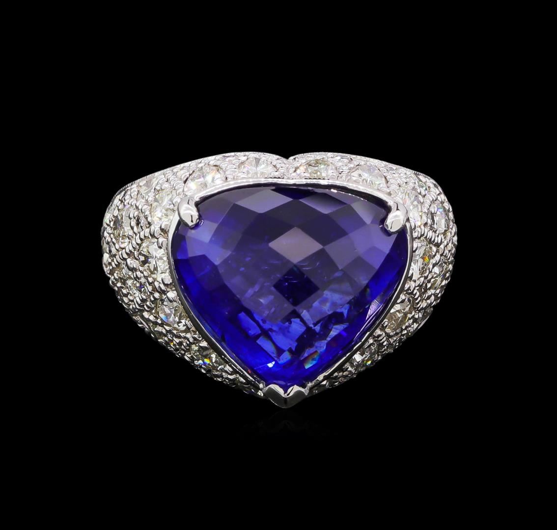 One electronically tested 18KT white gold ladies cast sapphire and diamond ring. The featured sapphire is set within a diamond studded curvature supported by a lattice under gallery and tapering shoulders, completed by a four millimeter wide band. Bright and patterned finish. Identified with markings of "750". Condition is good. Containing: One prong set triangle cabochon cut natural blue sapphire, measuring 11.90 x 12.90 x 7.90mm, approximate weight of 13.10ct., clarity is moderately included, type II, medium dark, very slightly grayish, blue color, (GIA B 6/3), cut is good. Transmitting light with a minimum of distortion, transparent. Naturally occurring internal & external characteristics are present. Graded in the setting. Twenty-Eight prong set pear shaped cut diamonds, measuring 3.00. x 2.25 x 1.42mm (depth est.) approximate total weight of 28 Stones = 1.61ct. Measurements are an average for the group. Graded in the setting, Graded in the setting. Clarity: VS-2 to SI-2 . Color: I - K Twenty-Two prong set round brilliant cut diamonds, measuring 1.30 - 1.20 x 0.75mm (depth est.) approximate total weight of 22 Stones = 0.18ct. Graded in the setting. Clarity: SI-1 to I-1 . Color: F - H. Total Weight of Colored Stones 13.10ct.. Total Weight of Diamonds 1.79ct.. Total Weight of Ring 10.19gm. AIG Appraised at $35,705.00.