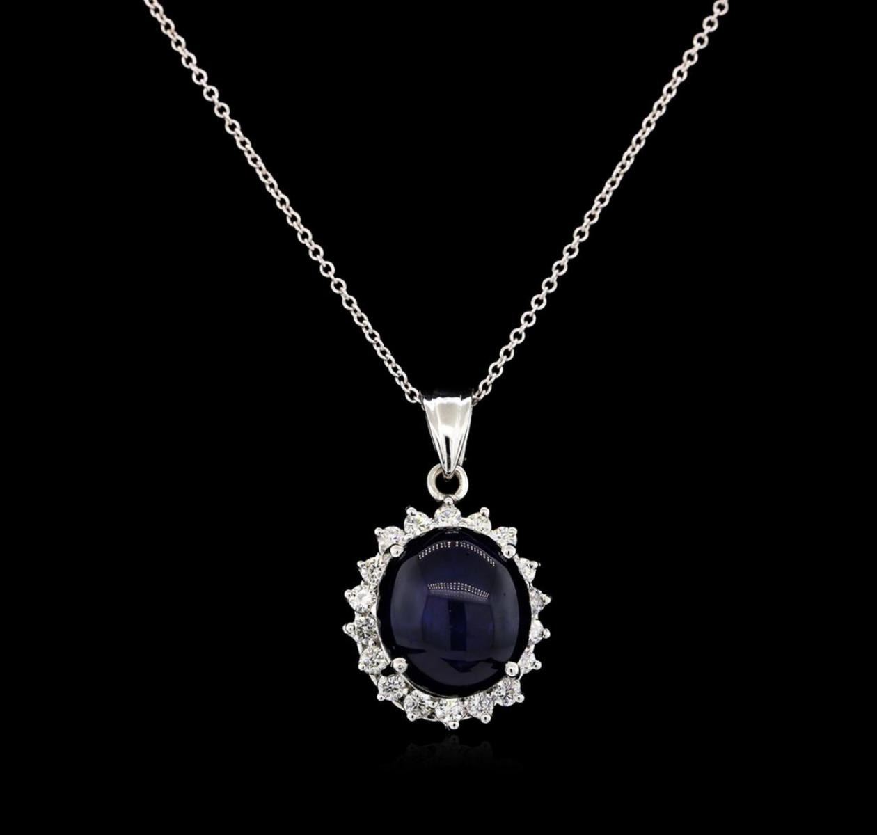 One pendant featuring: 14KT white gold weighing 3.95 grams containing one blue sapphire with a total weight of 13.12ct and diamonds with a total weight of 0.75ct.