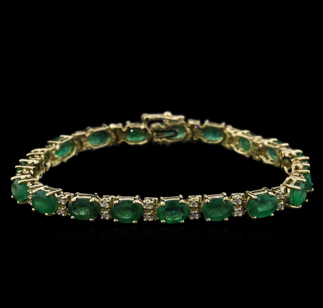 One electronically tested 14KT yellow gold lady's combination cast & assembled straight line fashion bracelet with a tongue clasp with foldover safety with a bright polish finish. The featured lady's bracelet measures approximately 7 inches in length. Identified with markings of "14K". Condition is new, good workmanship. Containing: Nineteen prong set oval modified brilliant cut natural emeralds, measuring 6.95 x 5.05 x 3.45mm, approximate total weight of 13.12ct., clarity is moderately included, type III, medium, moderately strong, green color, (GIA G 5/4), cut is good. Naturally occurring internal & external characteristics are present. Indications of oil residue. Colored gemstones are presumed to have been subjected to commonly used enhancement processes. Graded in the setting. Thirty-Eight prong set round brilliant cut diamonds, measuring 1.70 - 1.60 x 1.04mm (depth est.) approximate total weight of 38 Stones = 0.67ct. Graded in the setting. Clarity: SI-1 to I-1. Color: H - I. Cut Good. Total Weight of Colored Stones 13.12ct. Total Weight of Diamonds 0.67ct. Total Weight of Bracelet 14.60gm. GAS Appraised at $11,470.00.