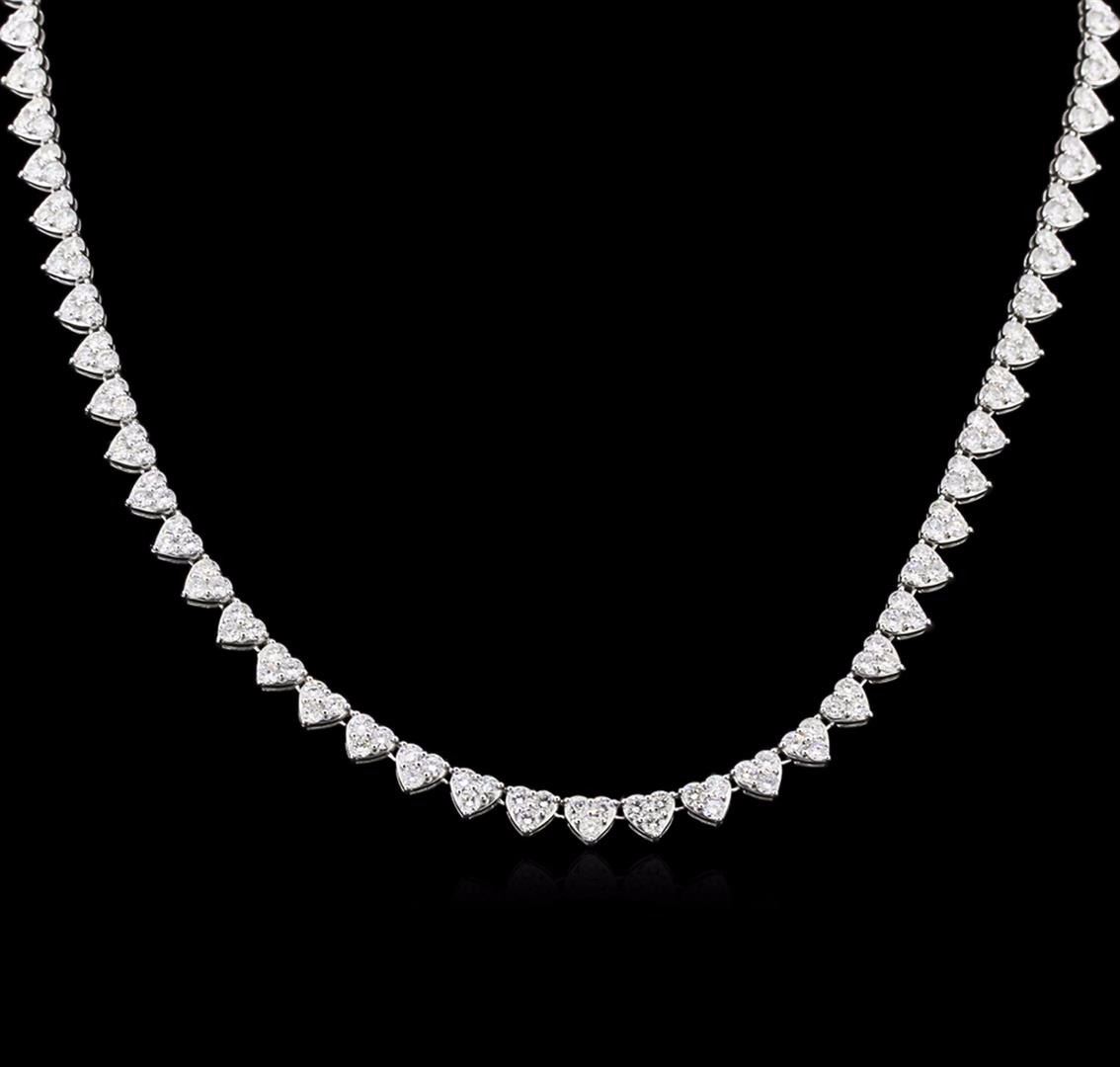 One electronically tested 18KT white gold lady's combination cast & assembled fashion tennis necklace with a tongue clasp with foldover safety with a bright polish finish. The featured lady's necklace contains 63 linked heart motifs and measures 16.5 inches long Identified with markings of "K18". Condition is new, good workmanship. Containing: One Hundred Eighty-Nine prong set round brilliant cut diamonds, measuring 2.70 - 2.60 x 1.62mm (depth est.) approximate total weight of 189 Stones = 13.14ct. Graded in the setting. Clarity: SI-2 to I-1. Color: G - I. Cut Good. Total Weight of Diamonds 13.14ct. Total Weight of Tennis Necklace 20.00gm. GAS Appraised at $27,945.00.