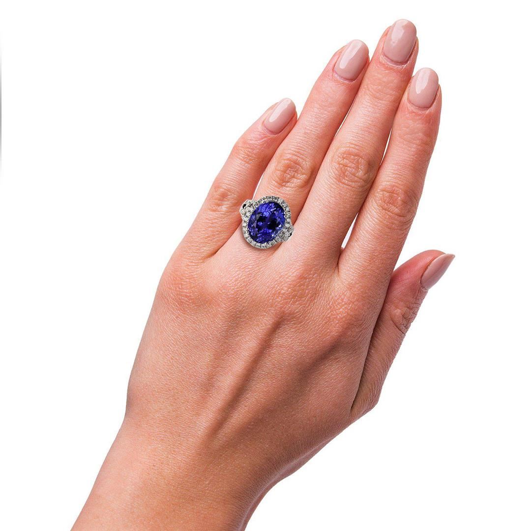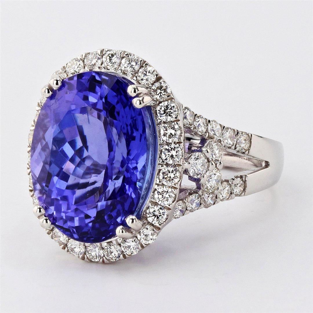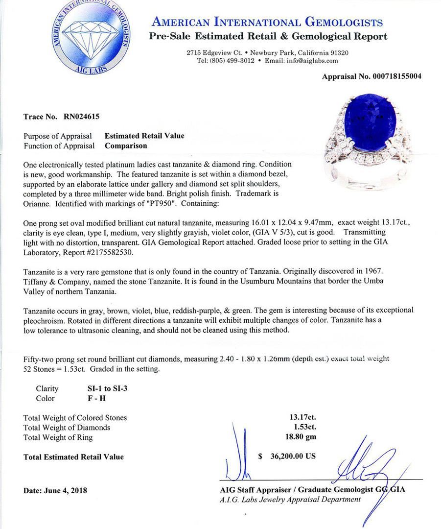 One electronically tested platinum ladies cast tanzanite & diamond ring. Condition is new, good workmanship. The featured tanzanite is set within a diamond bezel, supported by an elaborate lattice under gallery and diamond set split shoulders, completed by a three millimeter wide band. Bright polish finish. Trademark is Orianne. Identified with markings of "PT950". Containing: One prong set oval modified brilliant cut natural tanzanite, measuring 16.01 x 12.04 x 9.47mm, exact weight 13.17ct., clarity is eye clean, type I, medium, very slightly grayish, violet color, (GIA V 5/3), cut is good. Transmitting light with no distortion, transparent. GIA Gemological Report attached. Graded loose prior to setting in the GIA Laboratory, Report #2175582530. Tanzanite is a very rare gemstone that is only found in the country of Tanzania. Originally discovered in 1967. Tiffany & Company, named the stone Tanzanite. It is found in the Usumburu Mountains that border the Umba Valley of northern Tanzania. Tanzanite occurs in gray, brown, violet, blue, reddish-purple, & green. The gem is interesting because of its exceptional pleochroism. Rotated in different directions a tanzanite will exhibit multiple changes of color. Tanzanite has a low tolerance to ultrasonic cleaning, and should not be cleaned using this method. Fifty-two prong set round brilliant cut diamonds, measuring 2.40 - 1.80 x 1.26mm (depth est.) exact total weight 52 Stones = 1.53ctw. Graded in the setting. Clarity SI1 to SI3 Color F - H Total Weight of Colored Stones 13.17ct. Total Weight of Diamonds 1.53ctw. Total Weight of Ring 18.80 gm